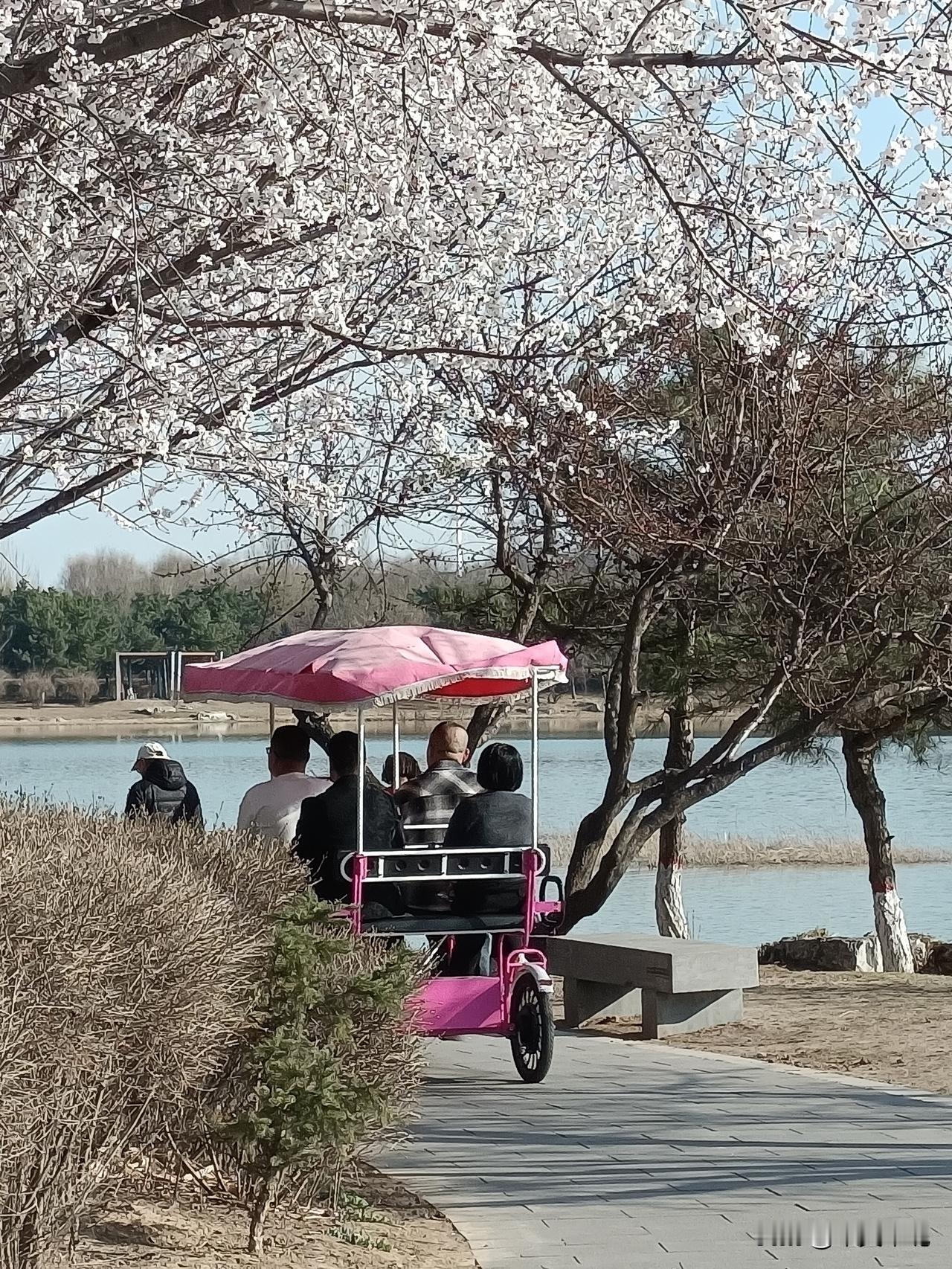 风过时,几片落花旋入水中,涟漪一圈圈荡开去。天很蓝,云很淡,那粉白竟像溶进了云天里——分不清是花映了天,还是天染了花。岸边石阶上青苔湿漉漉的,一只白鹭飞过,翅尖沾了水色。