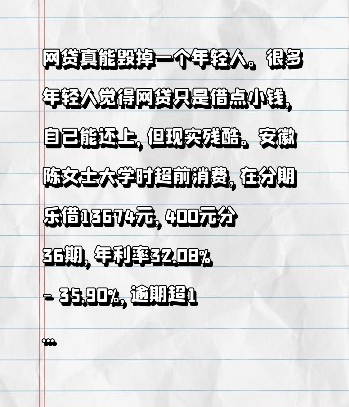 安徽陈女士大学时超前消费,在分期乐借13674元,400元分36期,年利率32.08% - 35.90%,逾期超1000天,还了1.1万仍需再还约1.5万。2021年超53%大学生用过分期产品,17.4%贷款买超预算商品。