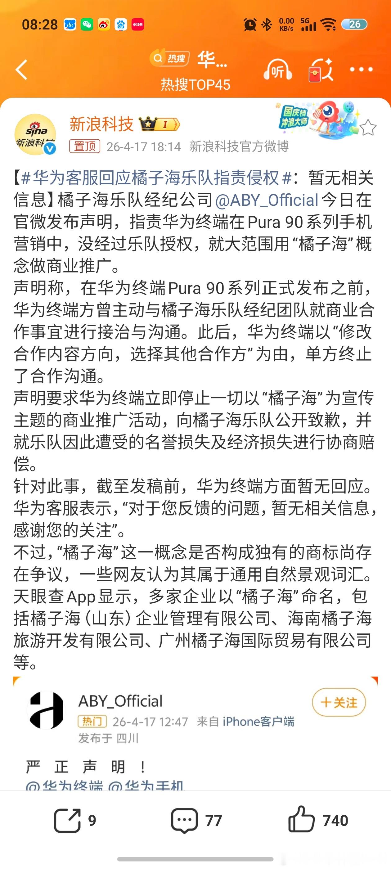 LH手机科技爱好者 华为Pura90系列配色官宣后,橘子海乐队指控华为侵权,要求立即停止以“橘子海”为主题的商业推广活动,而且还要向橘子海乐队公开致歉和赔偿损失。没想到能引起这么大的讨论风波,看了一下还有其它公司也在用橘子海命名。大家怎么看待这件事?华为客服回应橘子海乐队指责侵权