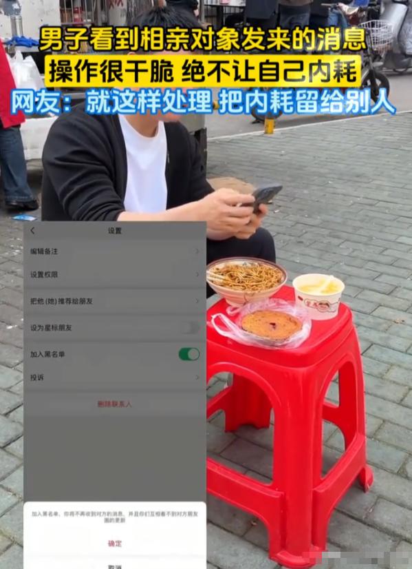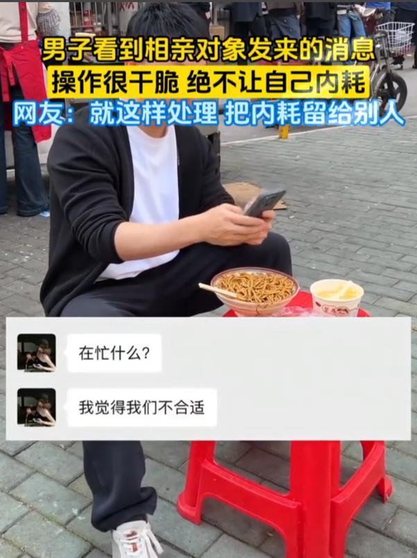 太清醒了!湖北,一男子吃早餐时,突然收到相亲对象发来的消息“我们两个不合适”,万万没想到,男生的胃口没受到一点影响,反而回消息、删好友,一通操作下来行云流水,网友:就该这样,把内耗留给别人!