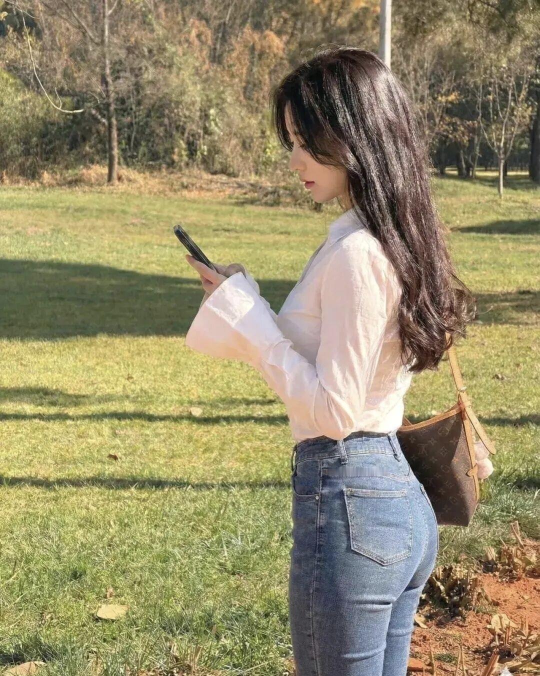 阳光下的甜美笑容,白色衬衫与牛仔裤的完美搭配,尽显自然与优雅。
