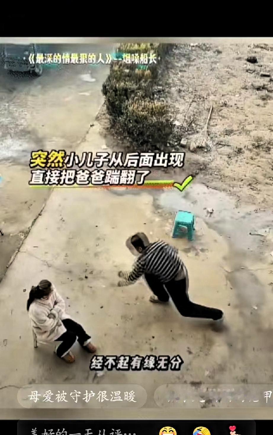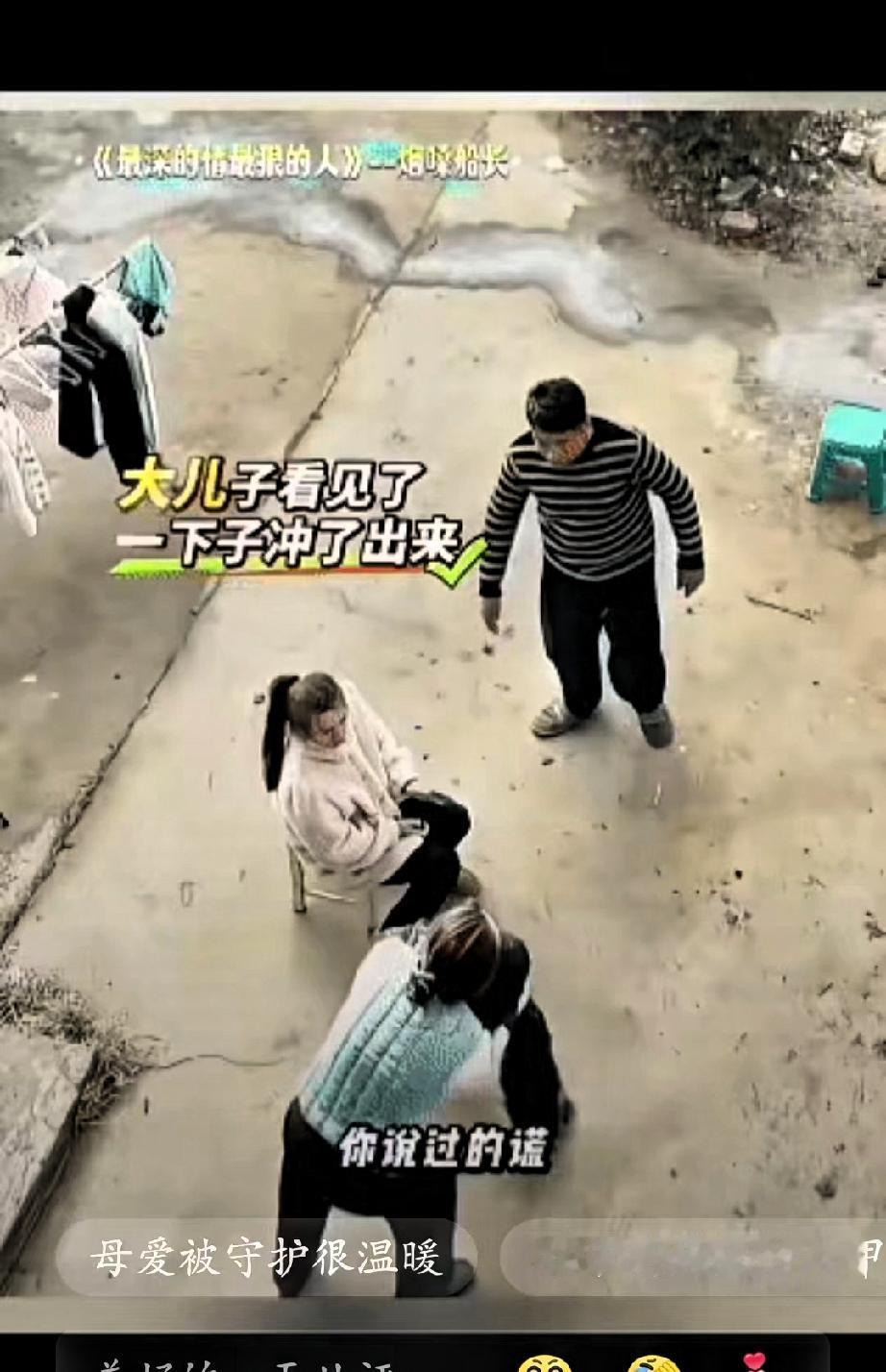 就在这时,年纪尚小的小儿子,趁父亲不注意,从背后轻轻一脚将他踹倒,用自己稚嫩的方式,挡在了妈妈身前,想要保护受委屈的妈妈。