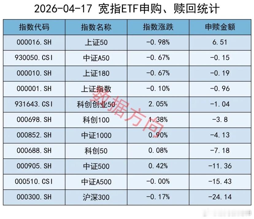 中证1000指数(-4.13亿)、科创100指数(-3.8亿)、科创创业50指数(-1.04亿)、上证指数(-0.96亿)、上证180指数(-0.19亿)、中证A50指数(-0.15亿),分别被小幅净赎回。
