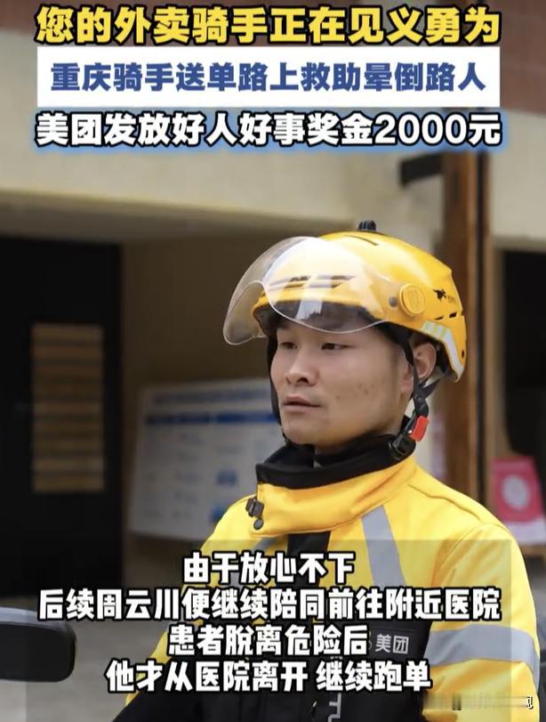 26年重庆的周云川,因路边人晕倒,呼吸微弱带头成立骑手志愿队为老人送药,排查隐患,直到伤者脱险才继续送单!