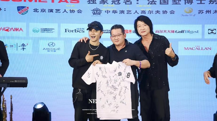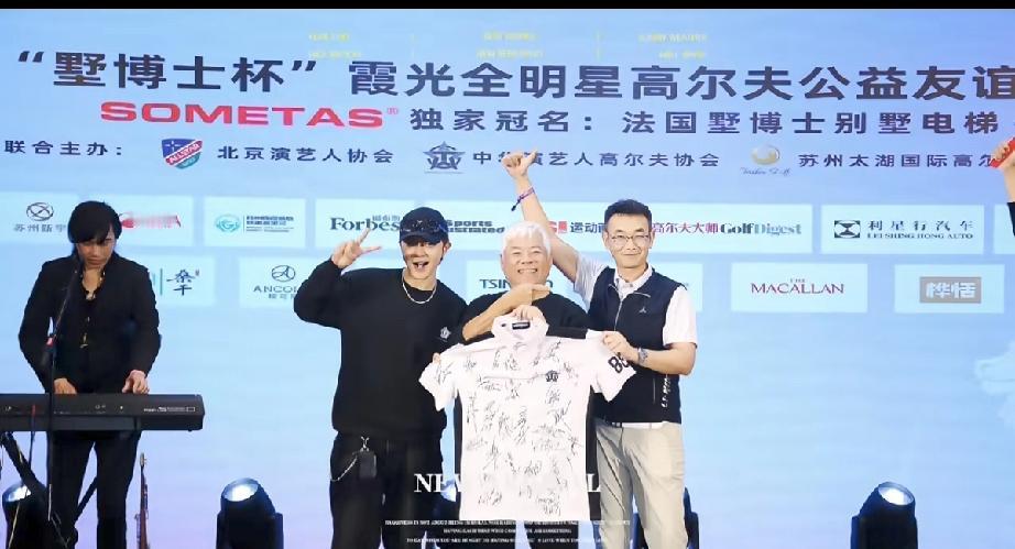 4月16日,罗志祥在江苏太湖白天打完高尔夫后晚上参加晚宴,喝的是红酒而不是白酒,还参加了运动服拍卖,状态很好。