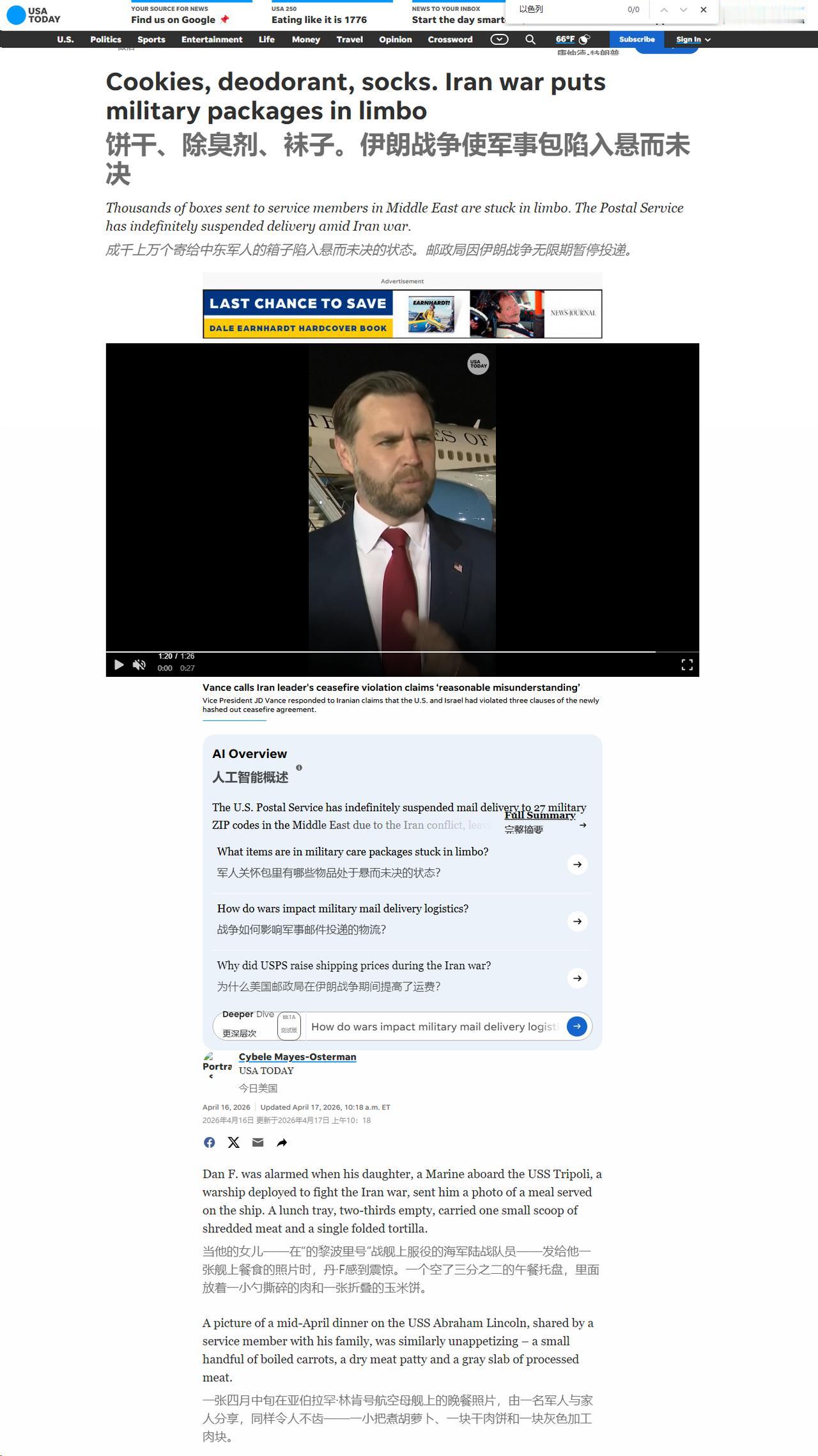 丹·F表示,他的女儿在“的黎波里号”上服役,船上的食物已经执行配给制,没有新鲜的农产品,船上的卫生用品也用完了。一名在在“的黎波里”号上服役的水手母亲听说儿子在船上挨饿了,感到非常恐慌。她至少花了2000美元购买关爱包,但目前没有一包送到她的儿子手上。在美伊战争发生后,邮寄给27个军事邮政编码的邮件根本无法投递。目前美伊战争暂停,但如何恢复并没有时间表。