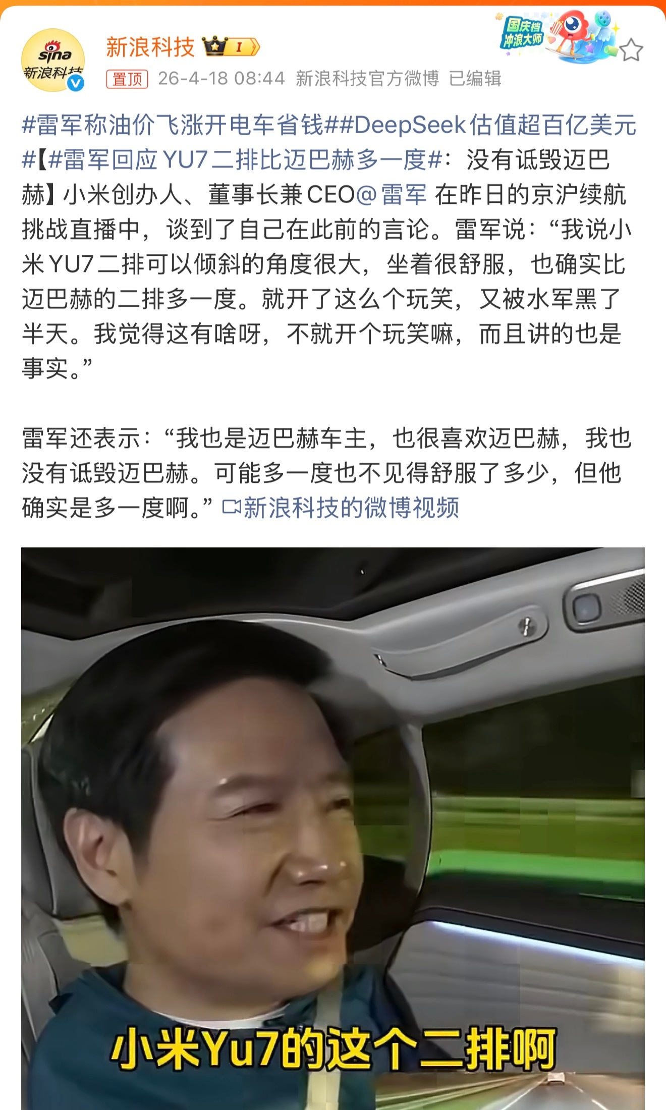 雷总说“可能多一度也不见得舒服了多少,但他确实是多一度”的时候,我也笑了哈哈哈,不过也是基于事实数据,就是开个小玩笑,更谈不上贬低了……我觉得也没啥,YU7的电动躺倒,我是车主,我自己坐后面的时候也经常来调节使用,也确实能缓解疲劳,没毛病 雷军回应YU7二排比迈巴赫多一度