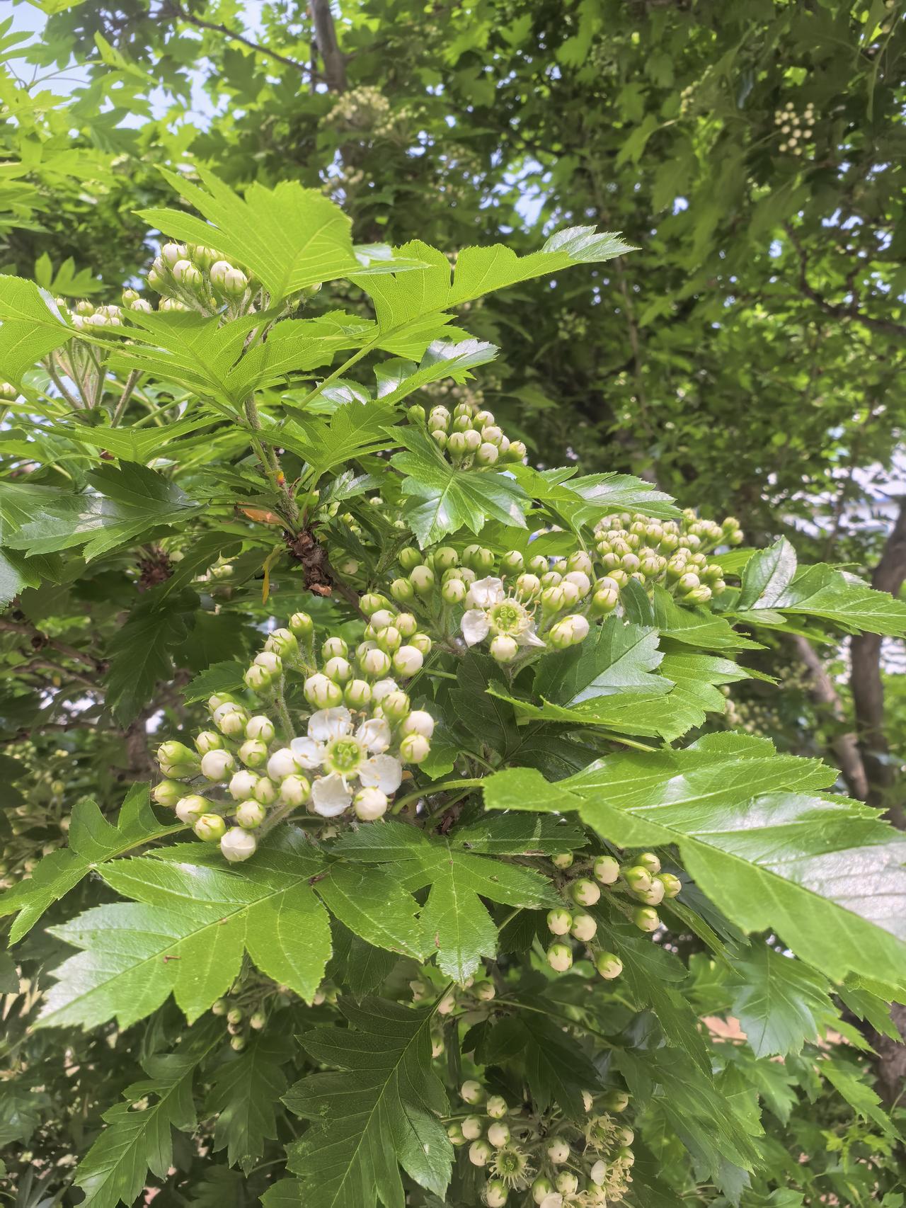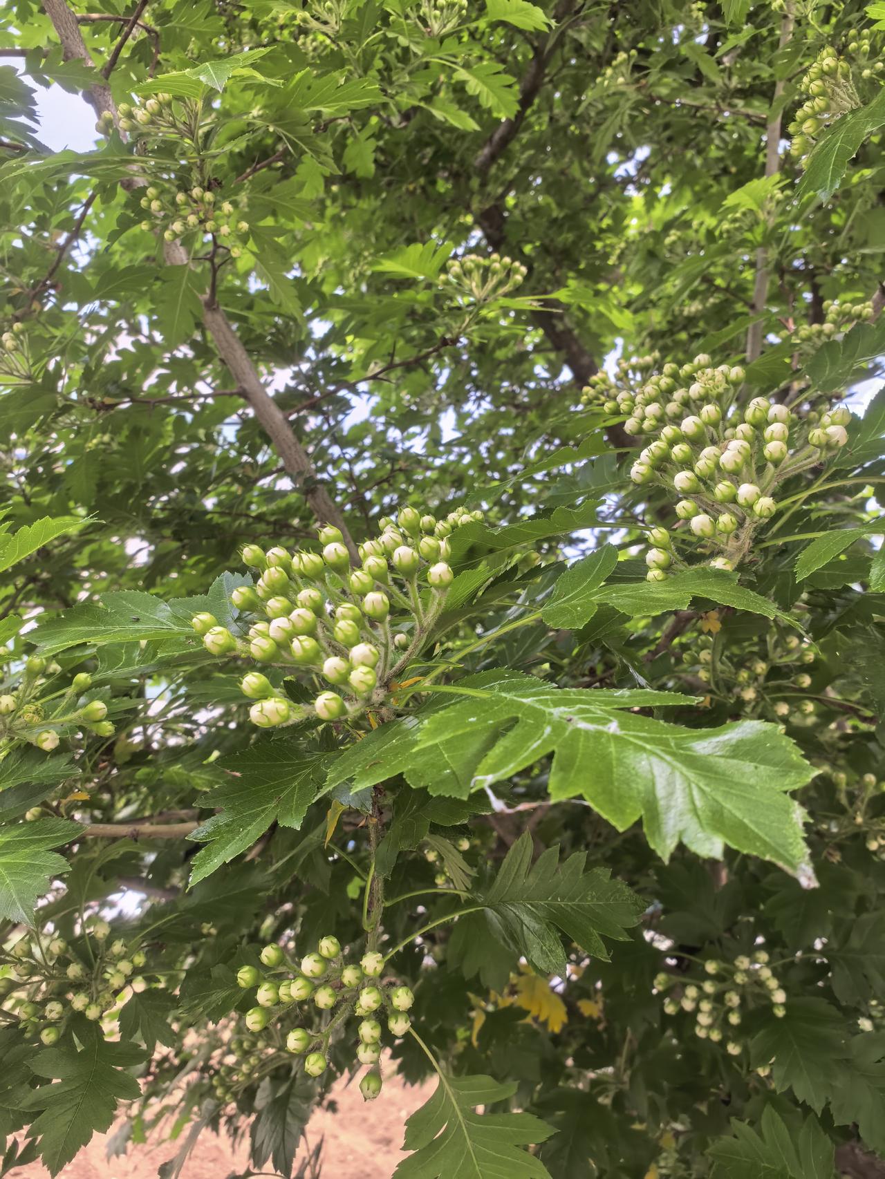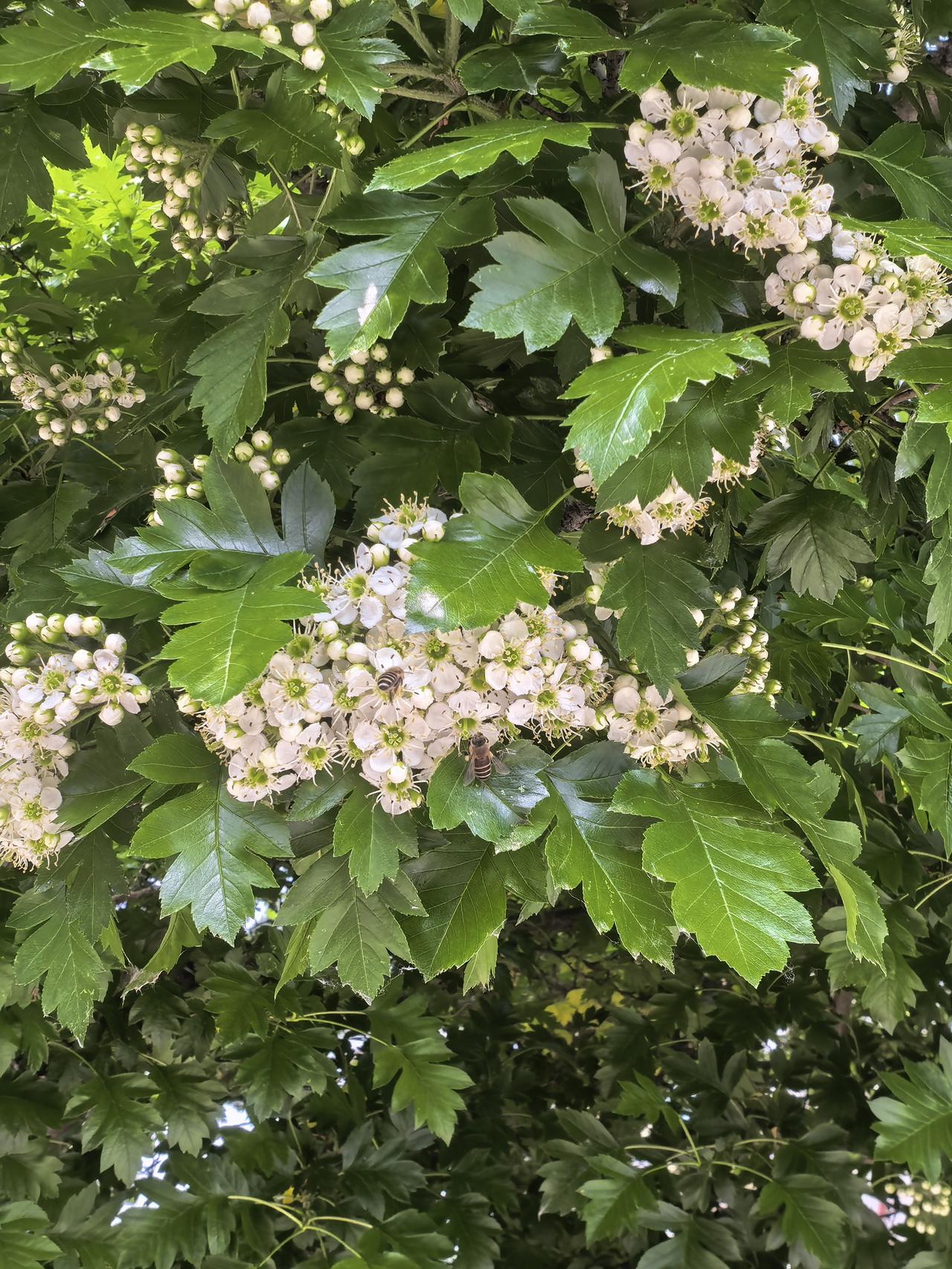 和珍珠一样的花朵,挂满一树,把蜜蜂都吸引来了,今年这花也太多了吧,肯定又结果不少。这是野山楂树,果子小,没有啥肉,里边全是果核,就是一层薄皮。年年也没人管它,它自己肆意的疯狂生长,越是天天浇树施肥的果树越不好好长,它倒好顶着风使劲长,三、四年的时间树干长的比盆还粗。这颗树果子没人吃,年年自然脱落,去年偶尔有人过来摘几个泡水喝,说是为了降脂。我是没有摘过,一点都不好吃。