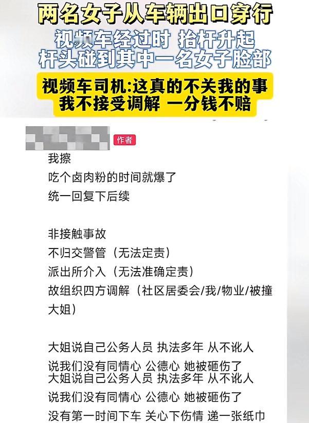 物业那边也很快表了态,说闸口早就贴了提醒,明确说明杆下禁止行人和非机动车通行,违者后果自负,他们已经尽到了安全管理的义务,大妈的受伤,应该由她自己承担。