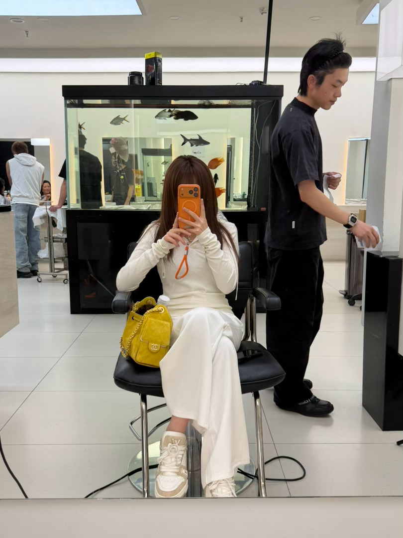 王濛的衬衫竟然不是一件拼接衬衫,而是用两件衬衫合在一起的,淡粉配淡蓝