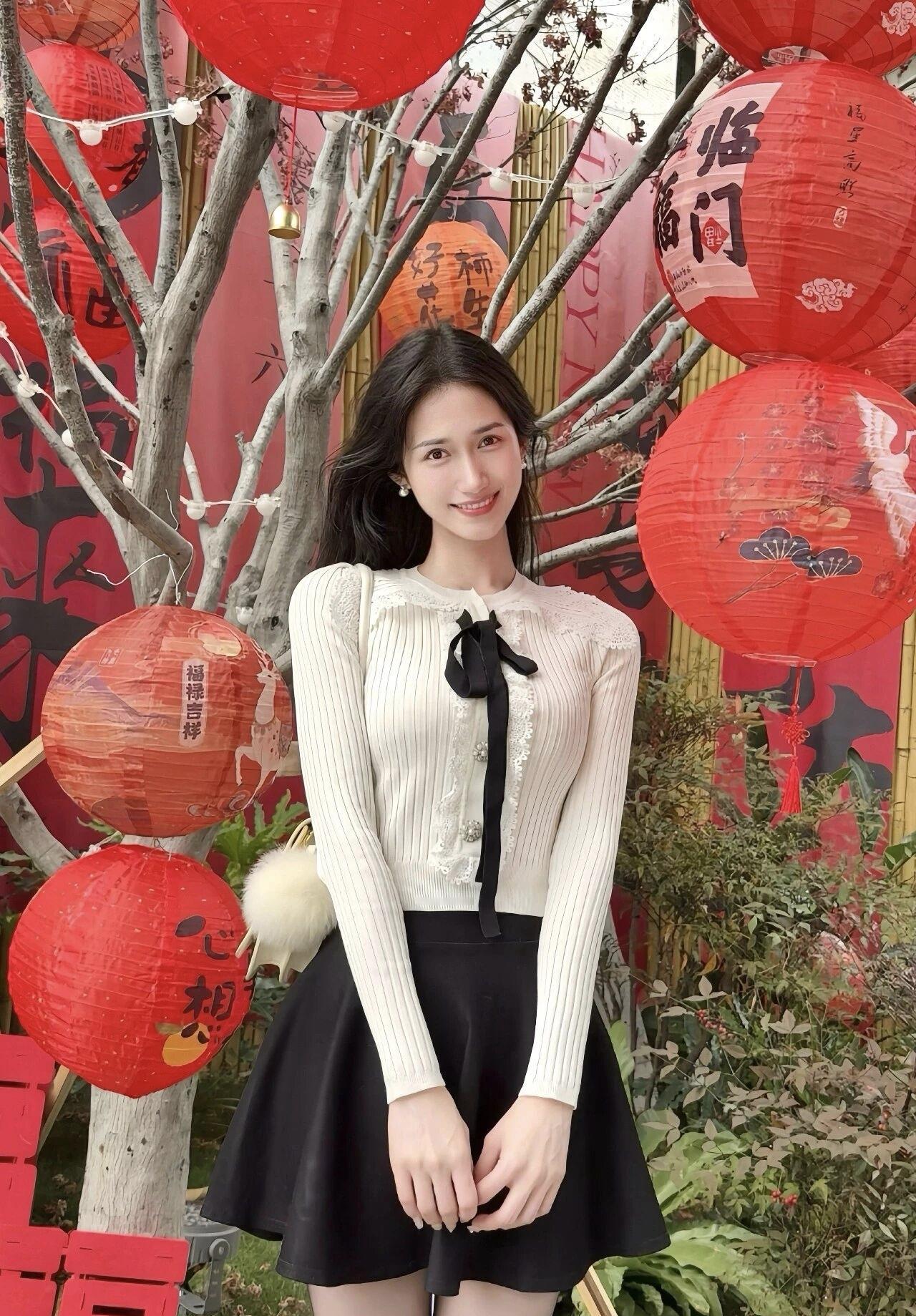 红灯笼映笑颜,福气满人间。