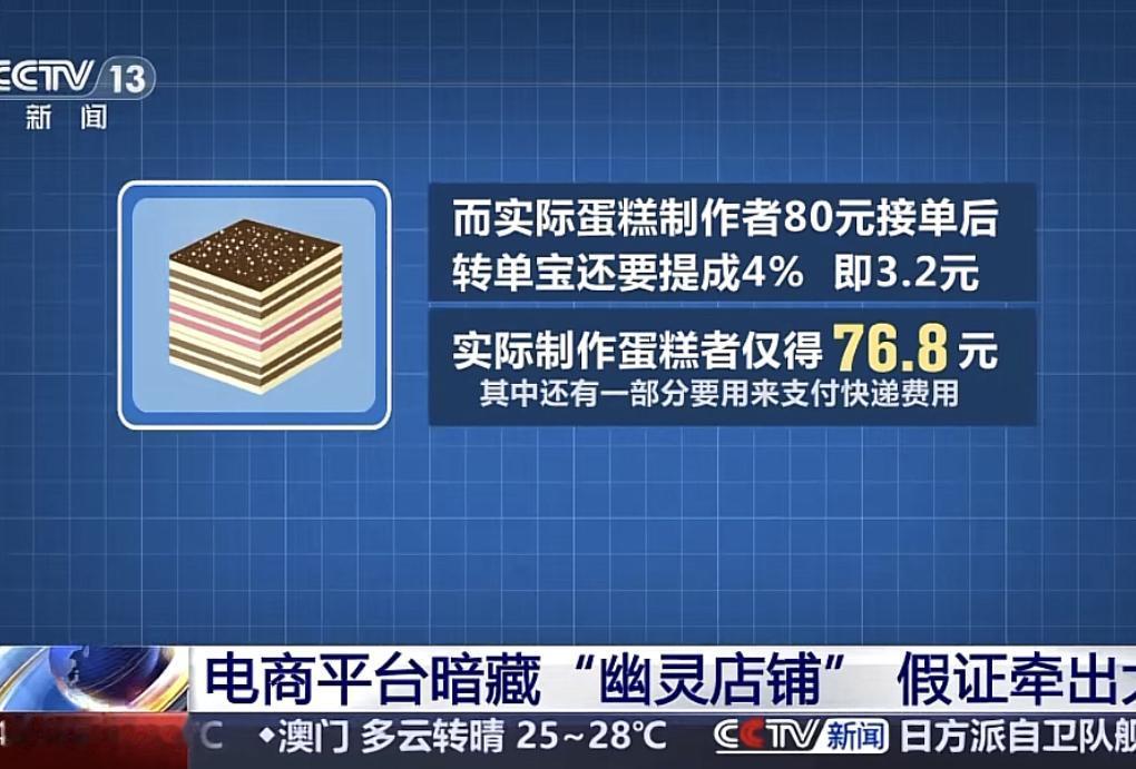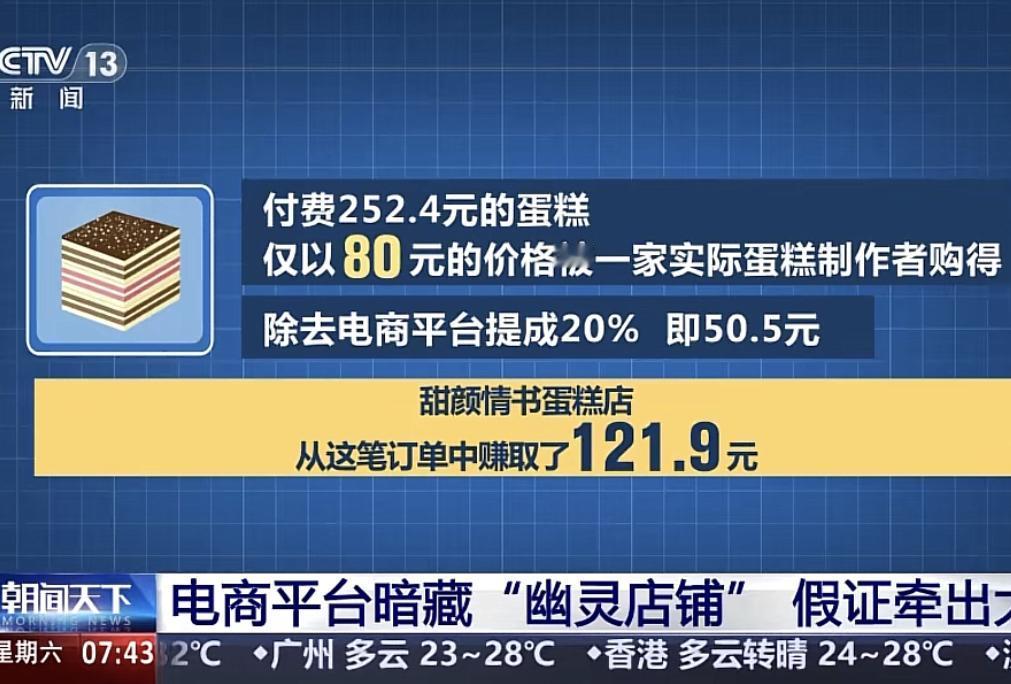 消费者在“幽灵店铺”花了252.4元买的蛋糕,实现上到手的是一个成本仅为76.8低质的蛋糕。这76.8块是蛋糕店出的,还要扣除送外卖的费用,那么,2/3的钱都让中间商给吃掉了。