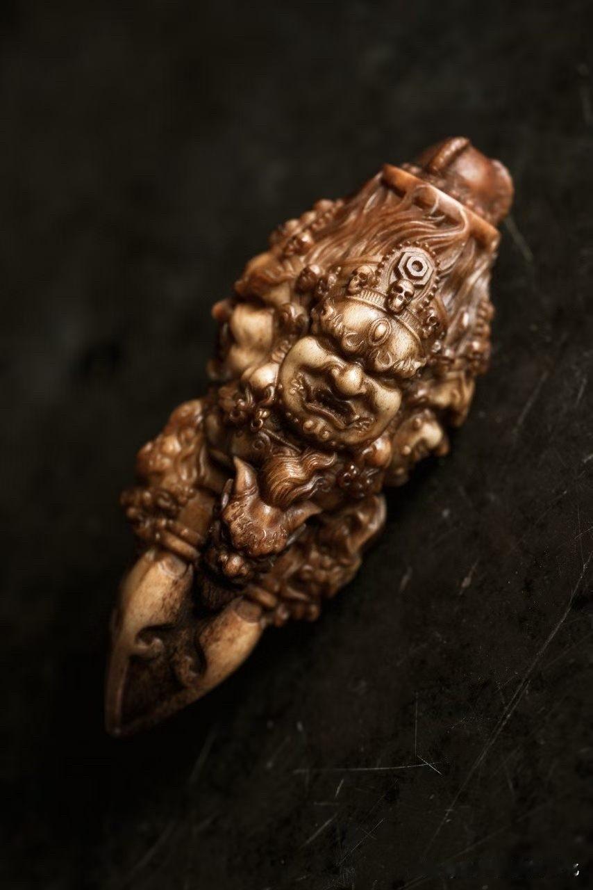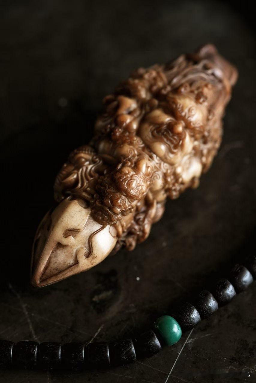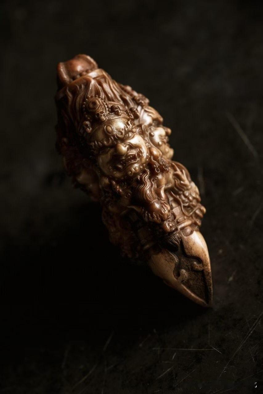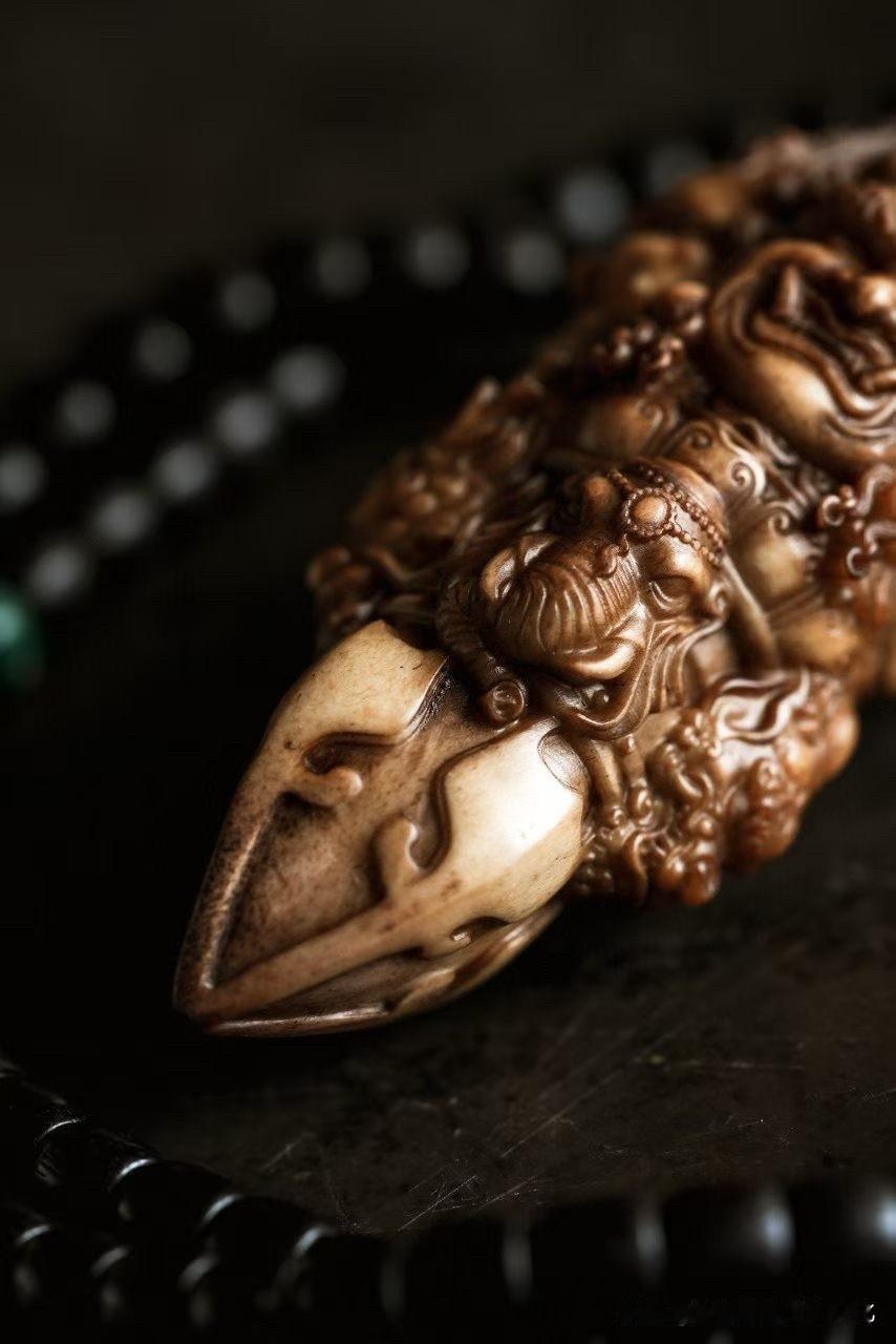 这枚金刚橛,以鹿角为骨,质地温润却不柔弱。刀下层层叠叠,忿怒相四面而出——獠牙、怒目、火焰发,细处极密,却不乱,反而越看越定。