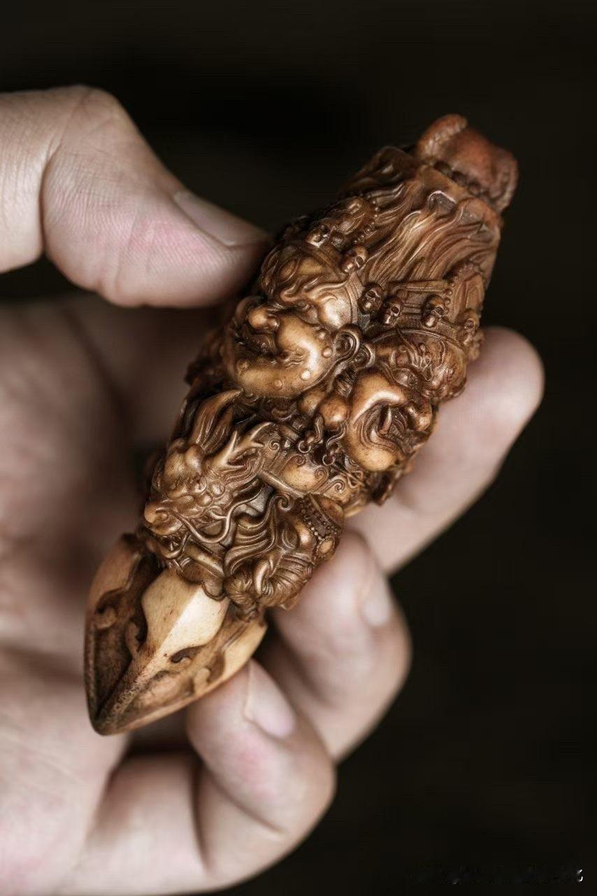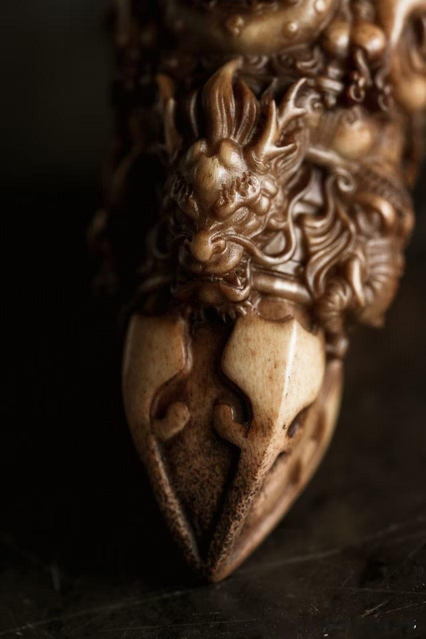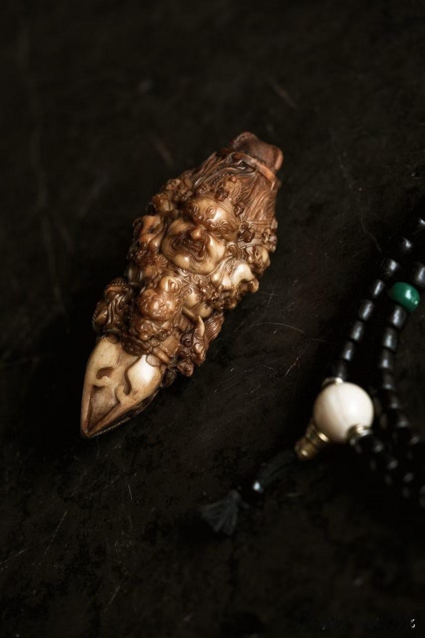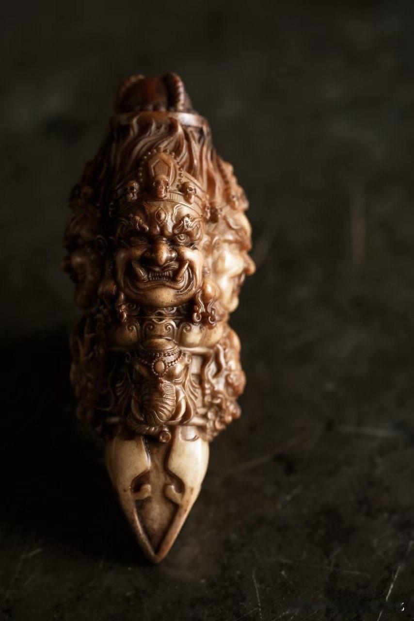 这枚金刚橛,以鹿角为骨,质地温润却不柔弱。刀下层层叠叠,忿怒相四面而出——獠牙、怒目、火焰发,细处极密,却不乱,反而越看越定。