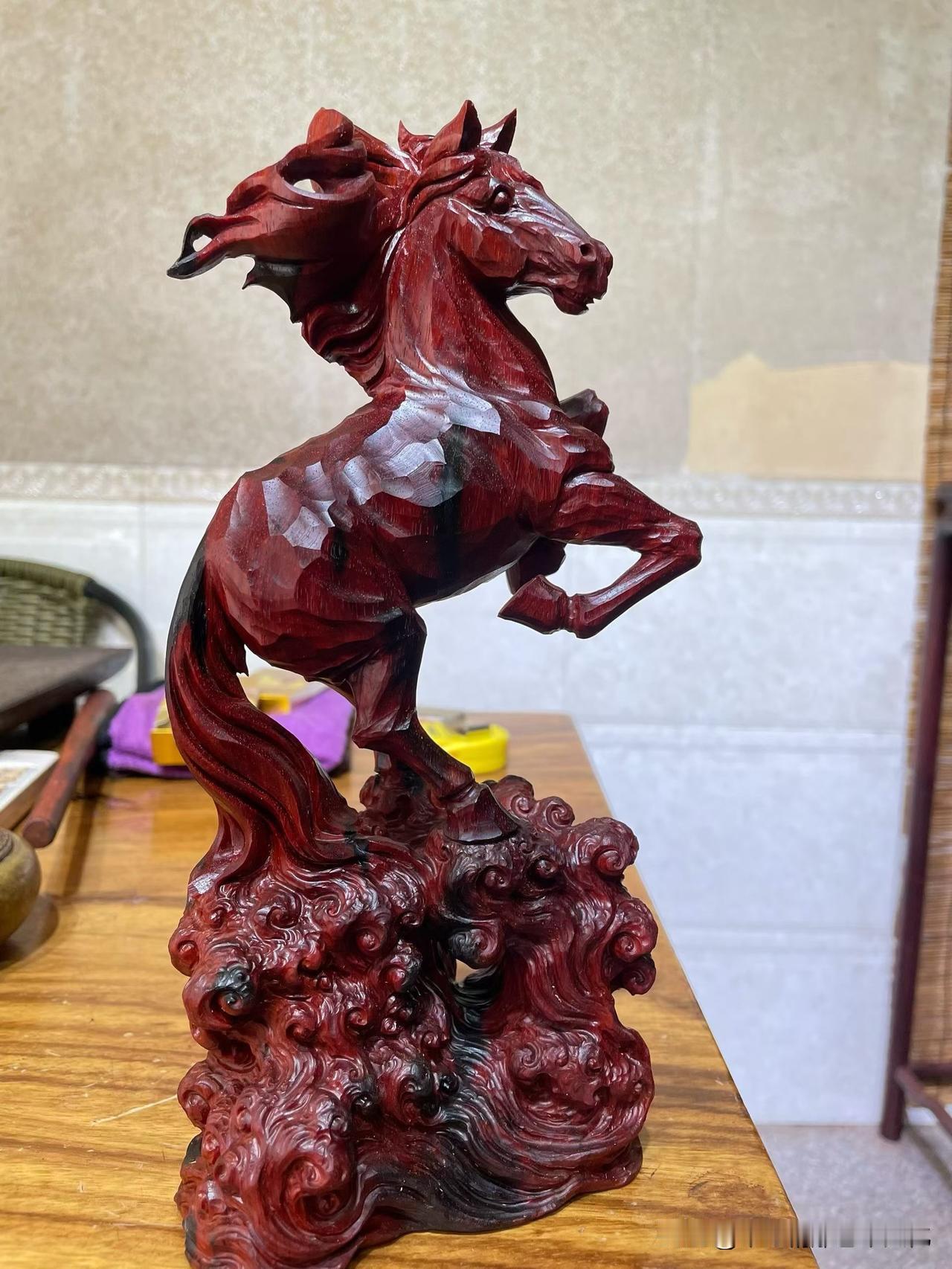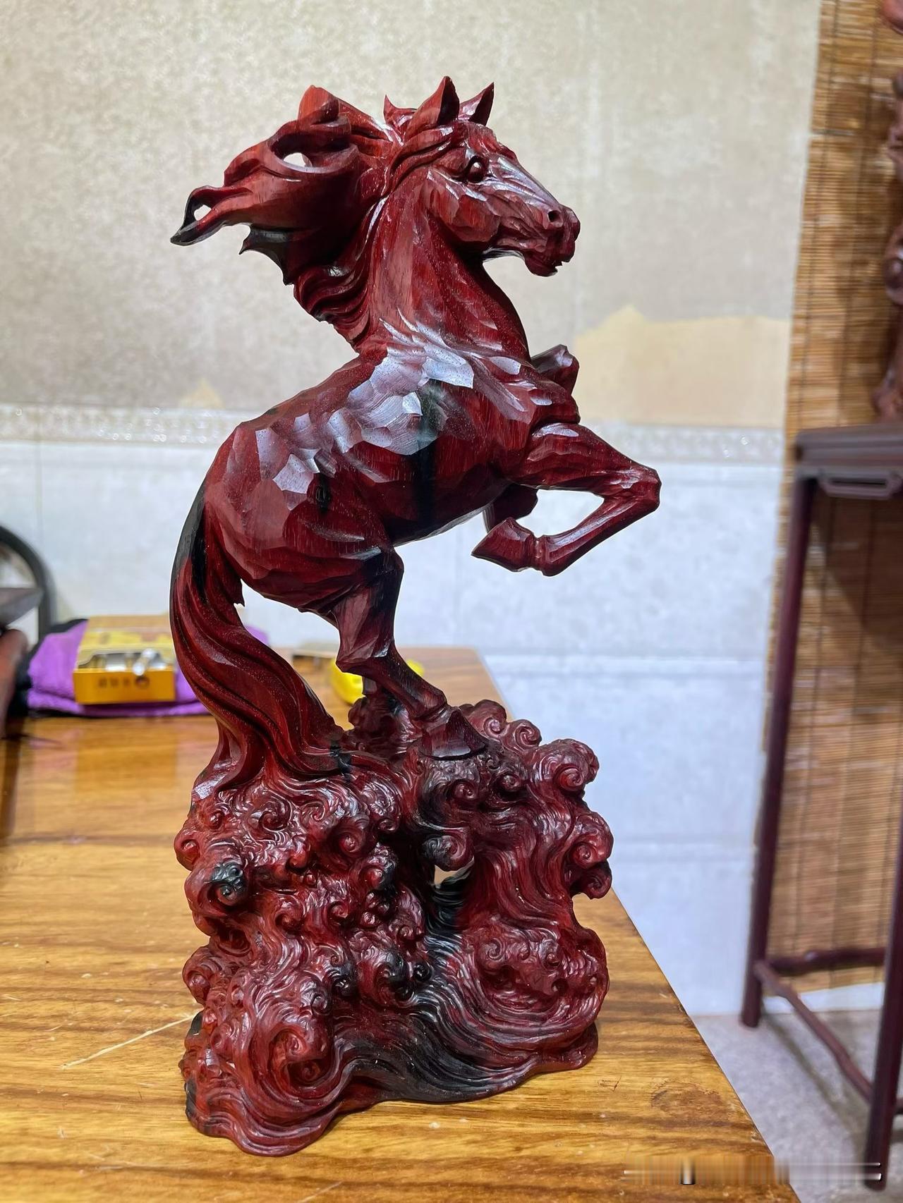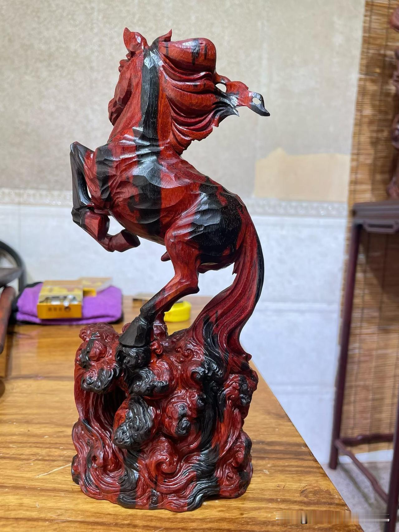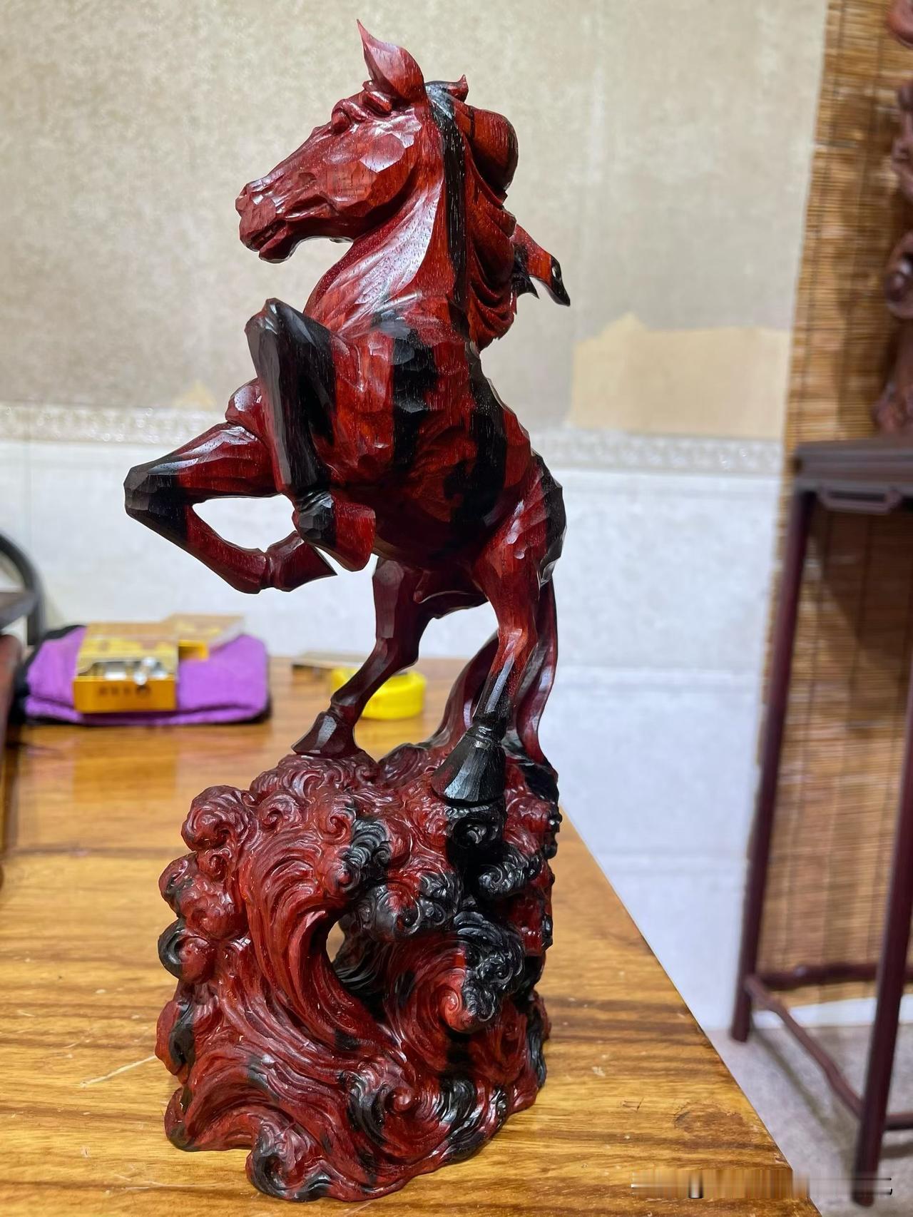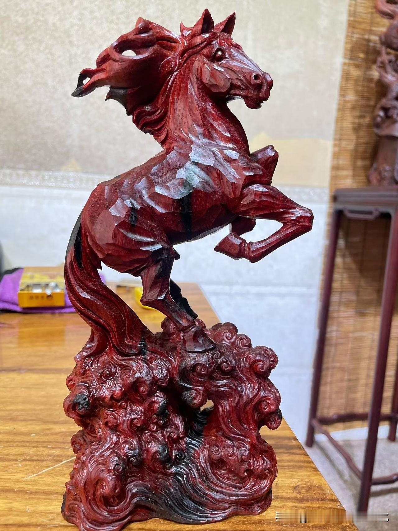 小叶紫檀的底子沉稳,油润内敛。整匹马却是腾起之势——前蹄提起,后腿稳住,像刚要冲,又被一瞬收住。