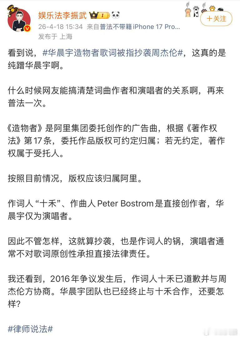 律师称造物者抄袭与华晨宇无关 法律责任划分清晰,抄袭问题与华晨宇无关,拒绝恶意捆绑,尊重事实与法律结论。