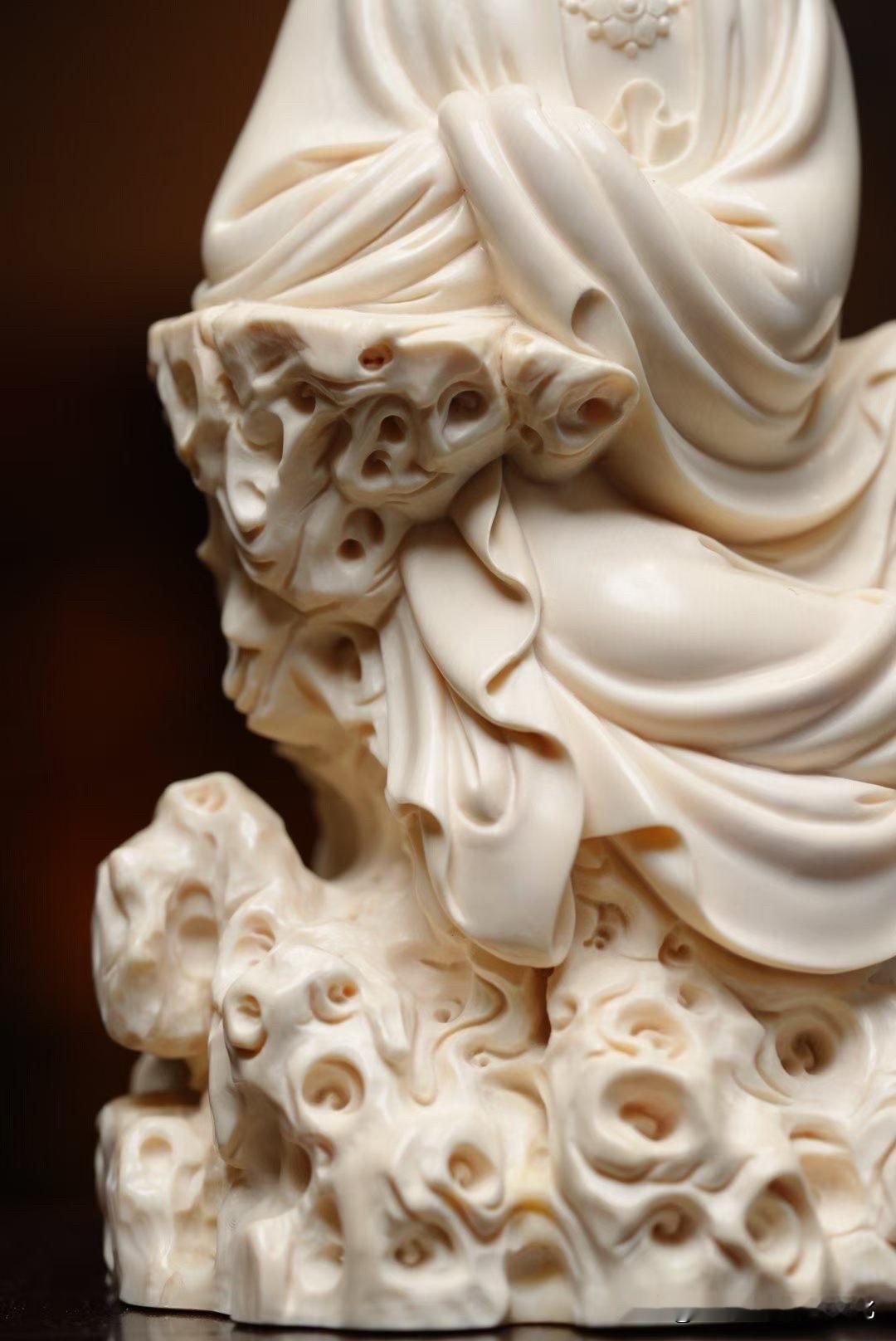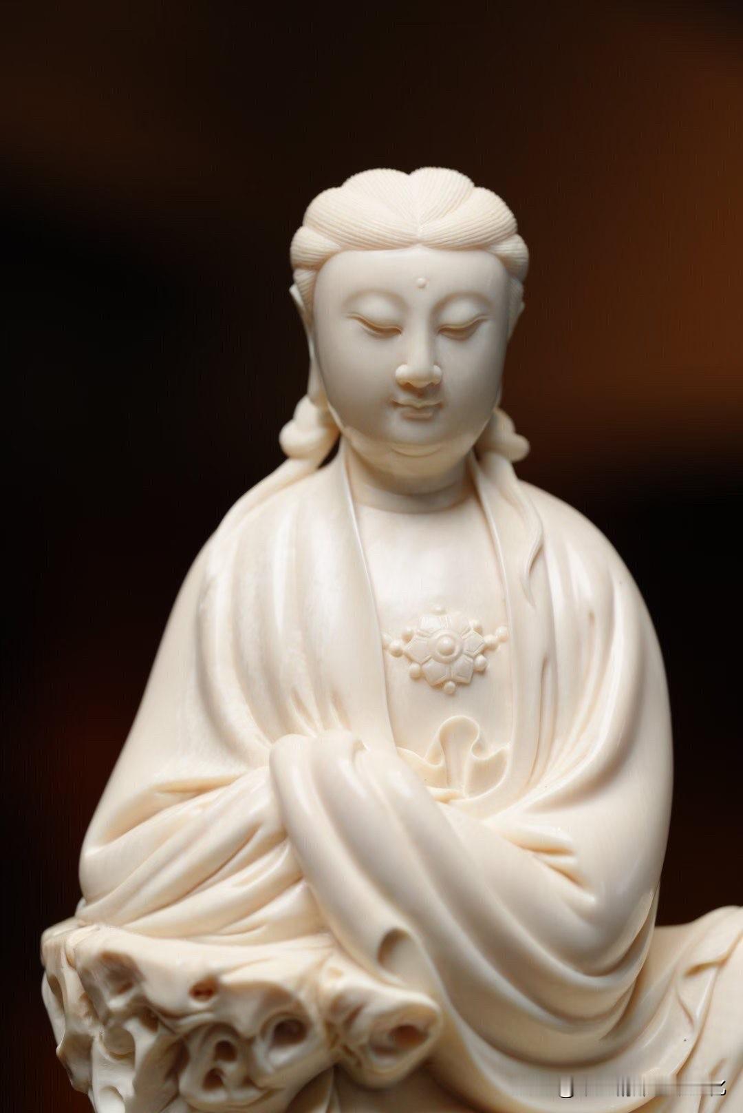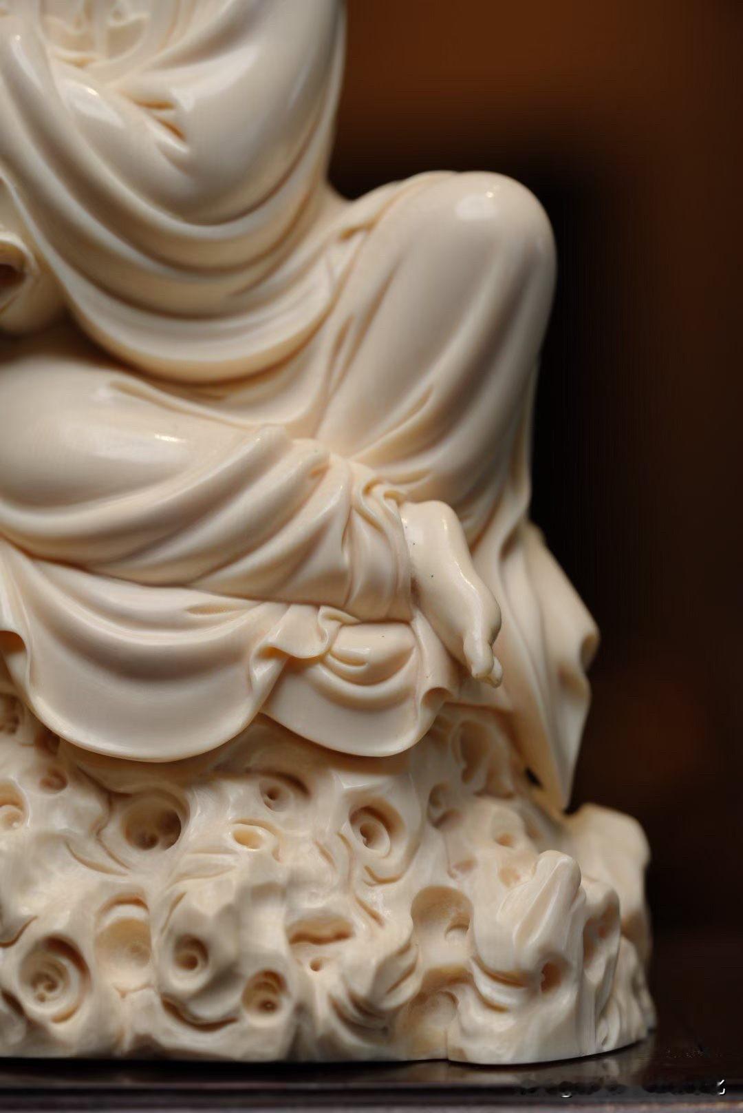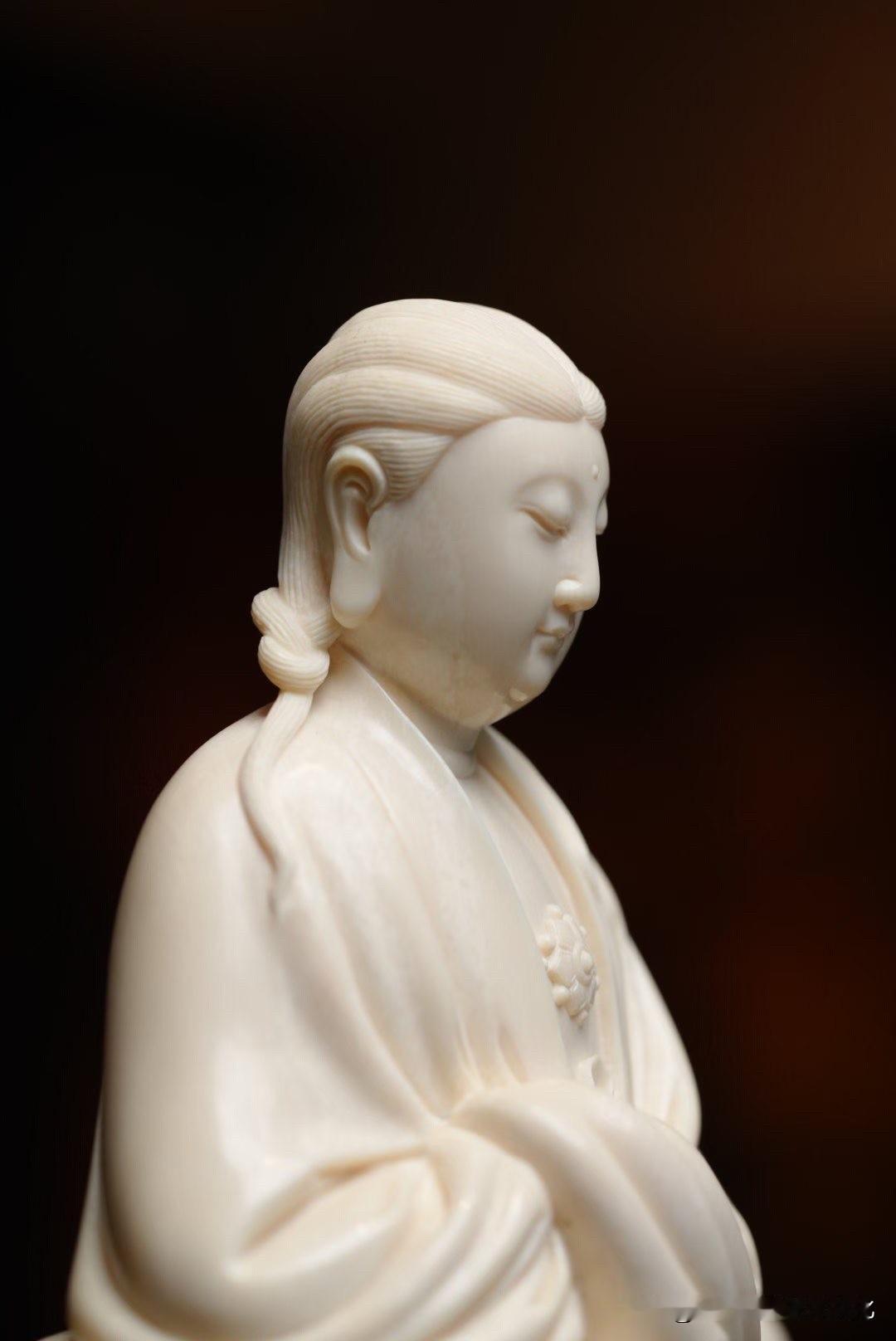 猛犸牙的质地温润细腻,白得不耀,却有光在里面流。衣纹一层层垂落,线条干净克制,像风轻轻停过。整件作品,没有多余的动作,却处处都在呼吸。