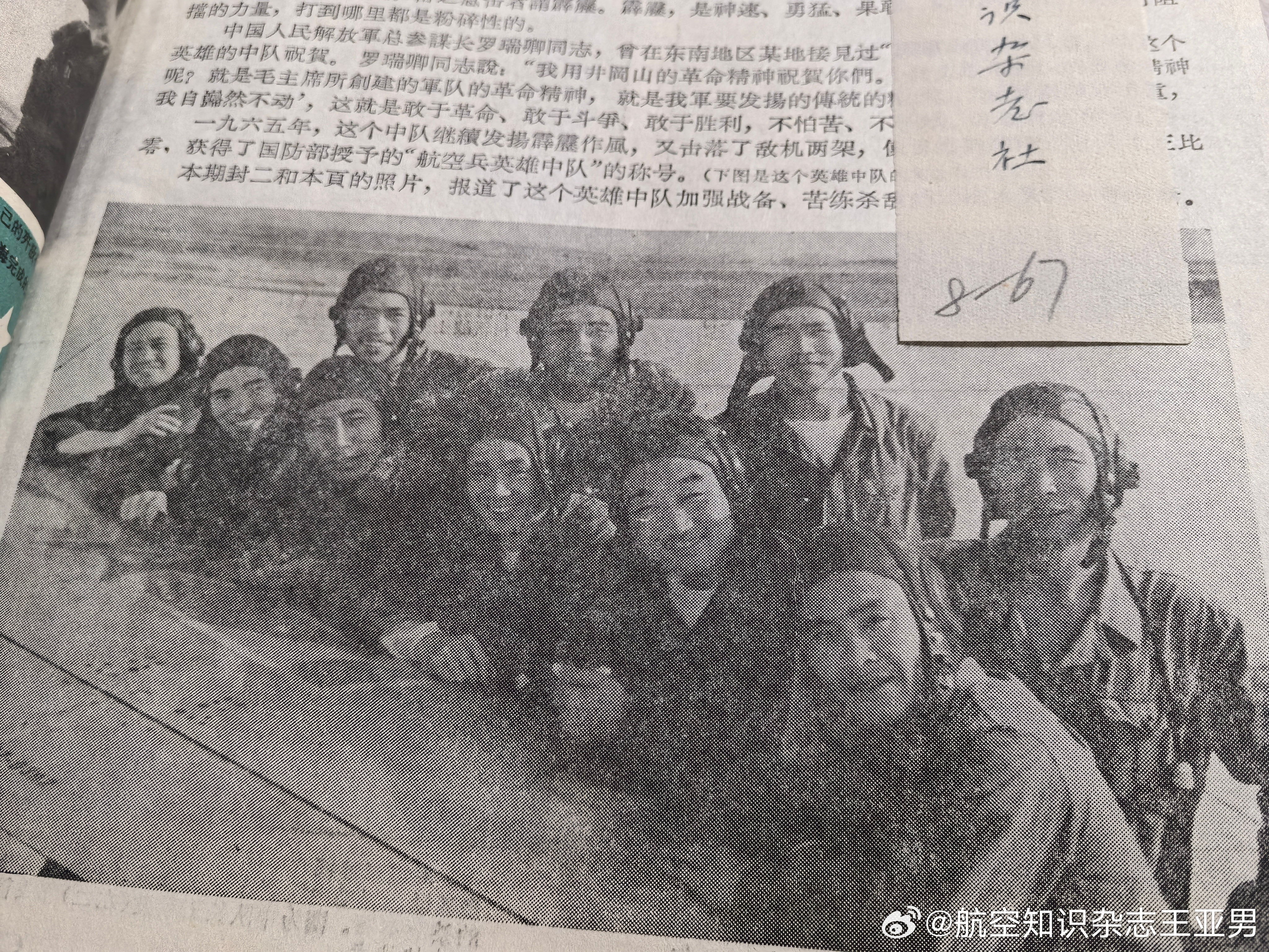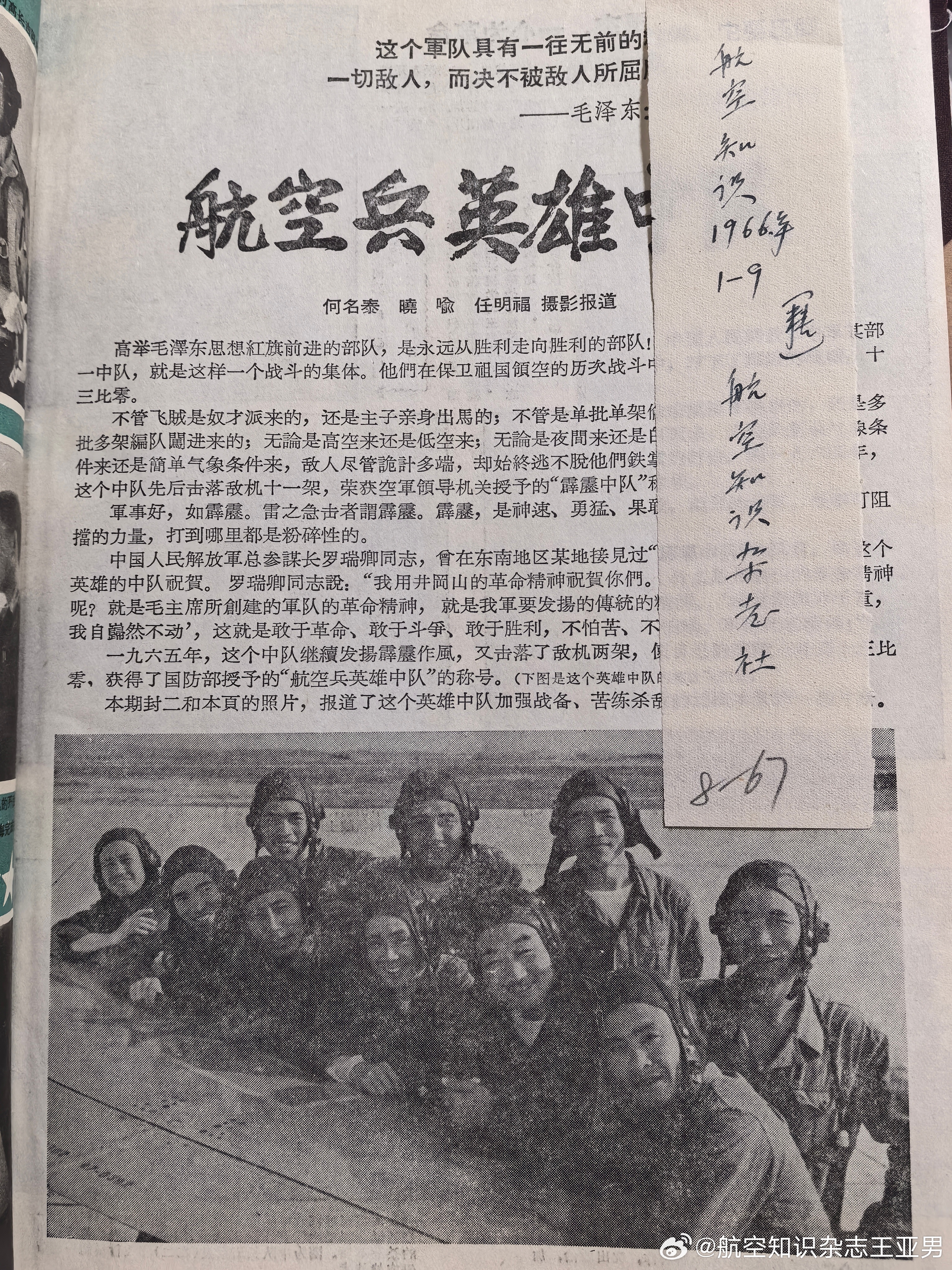 1966年1期《航空知识》封二和对页刊载的《航空兵英雄中队》,就是高长吉和董小海所在部队,当年因为屡屡击落敌机,被授予“霹雳中队”荣誉称号。当时杂志上没有说明,现在我们知道,这支部队就是空18师54大队1中队。说实话,下面那张全中队飞行员合影,很令人心动,这张片子拍摄得有温度,不刻板,每个人都有自然的笑容,大家随意聚在战机机翼旁,留下这张照片,超越了当时许多作品的僵化味道。特别值得回味。顺带说一句,我手里这本1966精装合订本上面的钢笔手书字条,严重怀疑是谢础老师手迹,不过我还得去问问老同志们才能确认。