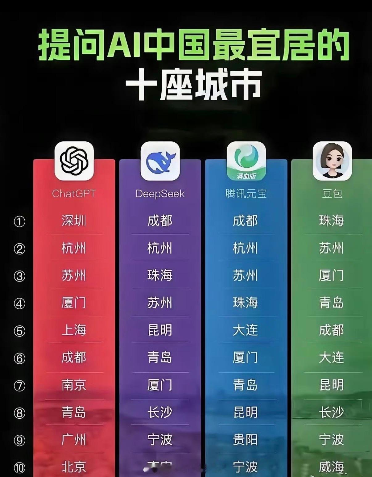 广州 — 医疗教育强、配套全能成都 — 生活安逸、美食、医疗强杭州 — 生态好、数字经济、宜居标杆南京 — 人文+经济+环境均衡长沙 — 房价友好、医疗教育强青岛 — 北方海滨、空气好、气候舒适珠海 — 空气质量佳、生态宜居深圳 — 经济活力、城建交通一流昆明 — 春城、四季如春苏州 — 园林、经济强、生活安逸