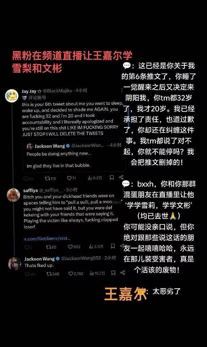王嘉尔在推特怼黑粉王嘉尔这波操作太刚了!直接在推特正面硬刚黑粉,这在内娱属实少见