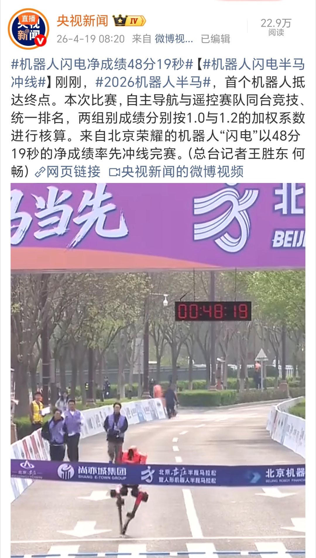 2026机器人半马不负众望,荣耀自研机器人闪电以48分19秒的净成绩率先冲线完赛。闪电实至名归!300个机器人跑半马中国硬核科技太牛了!