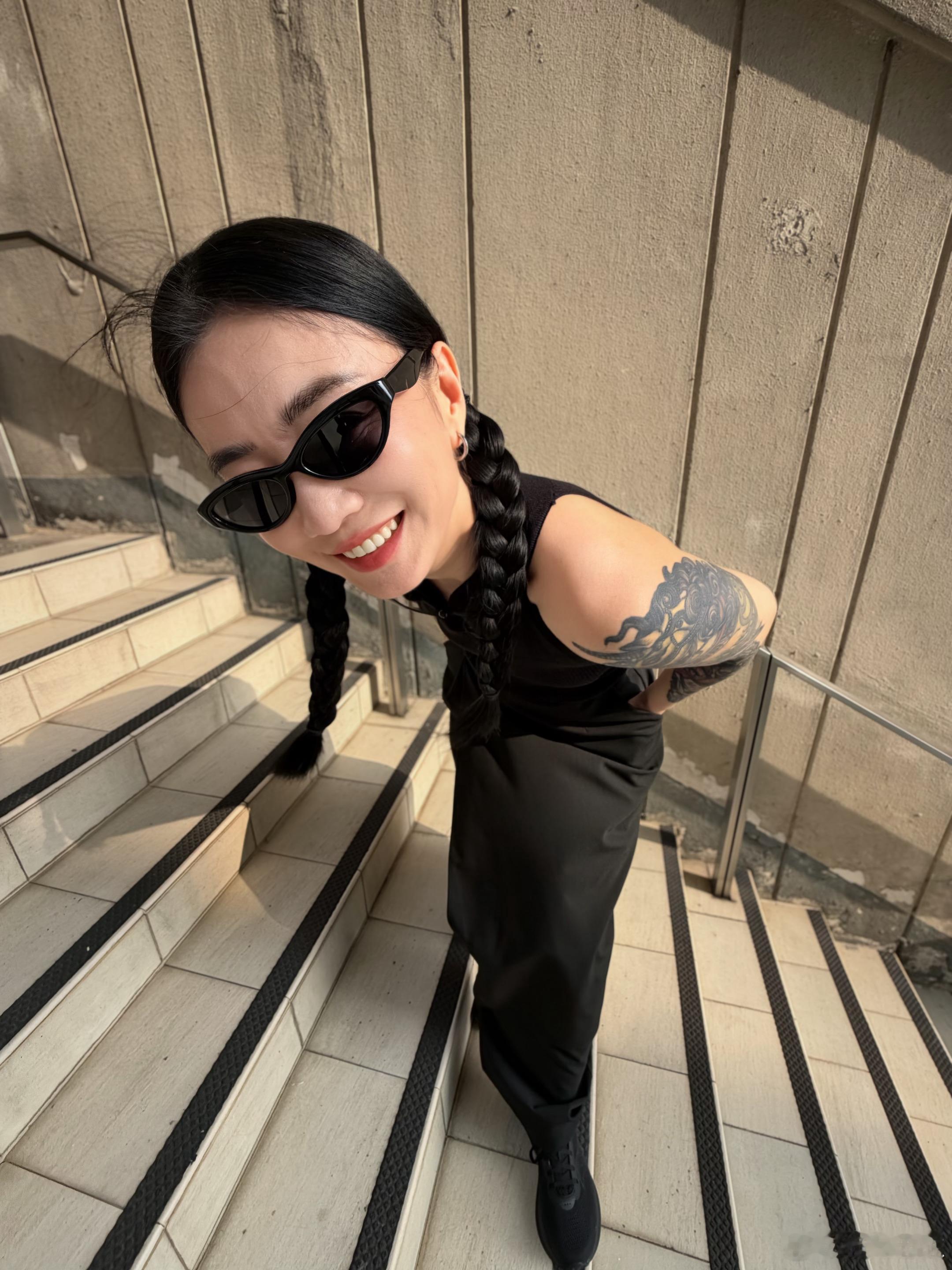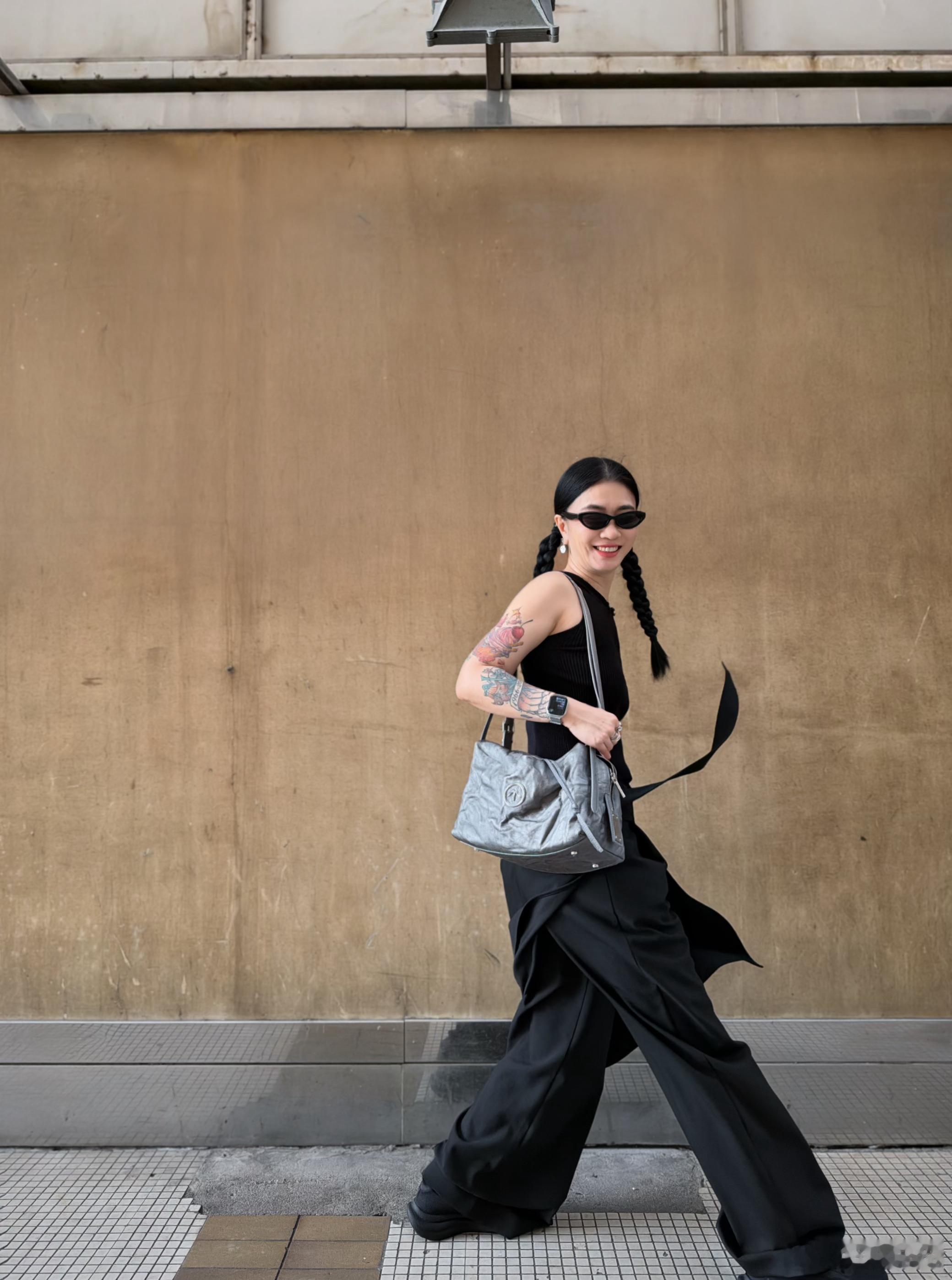 江疏影街拍,一身黑色蛮帅气!她身穿黑色运动套装,廓形外套搭配同系列长裤,利落又