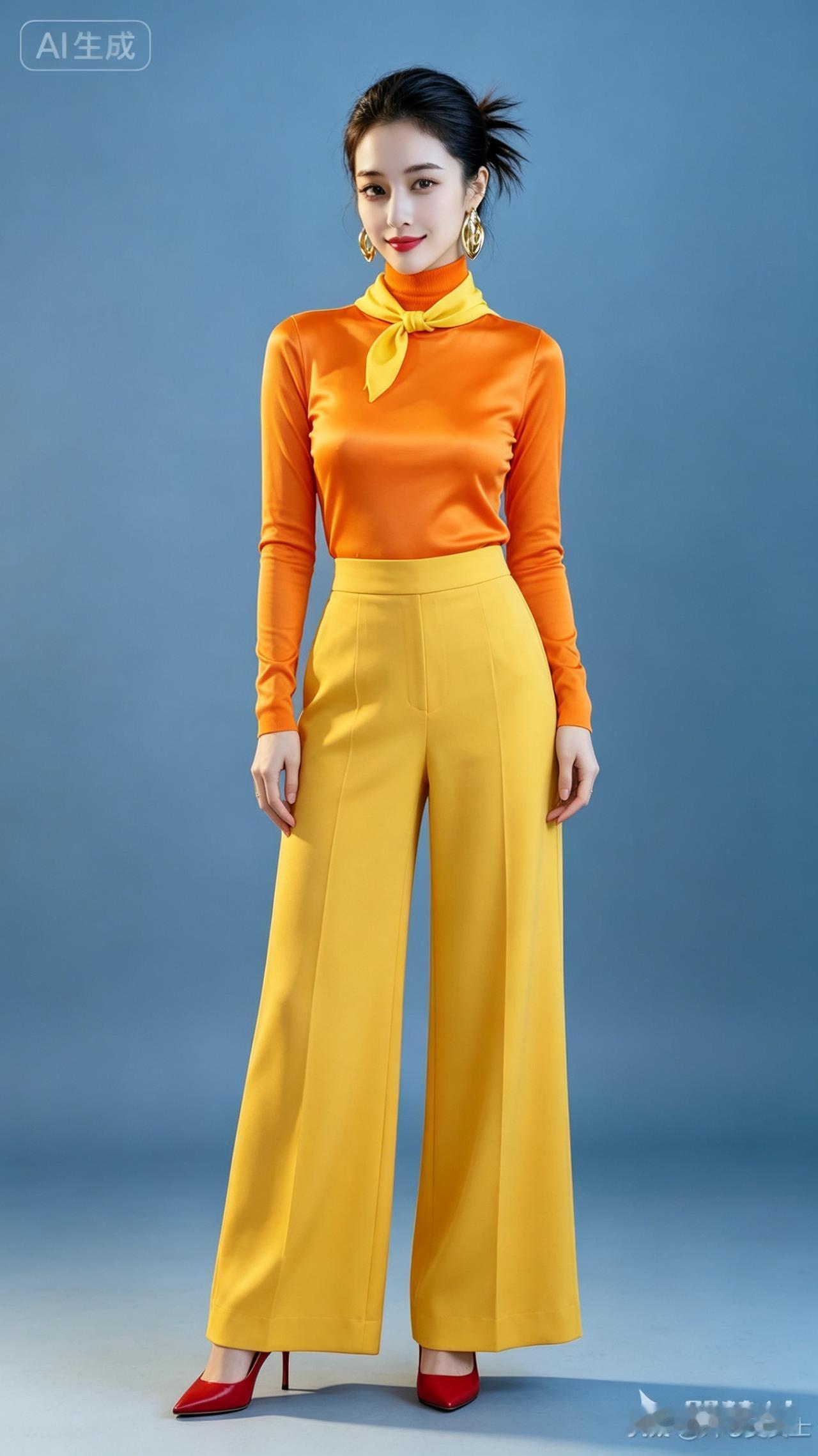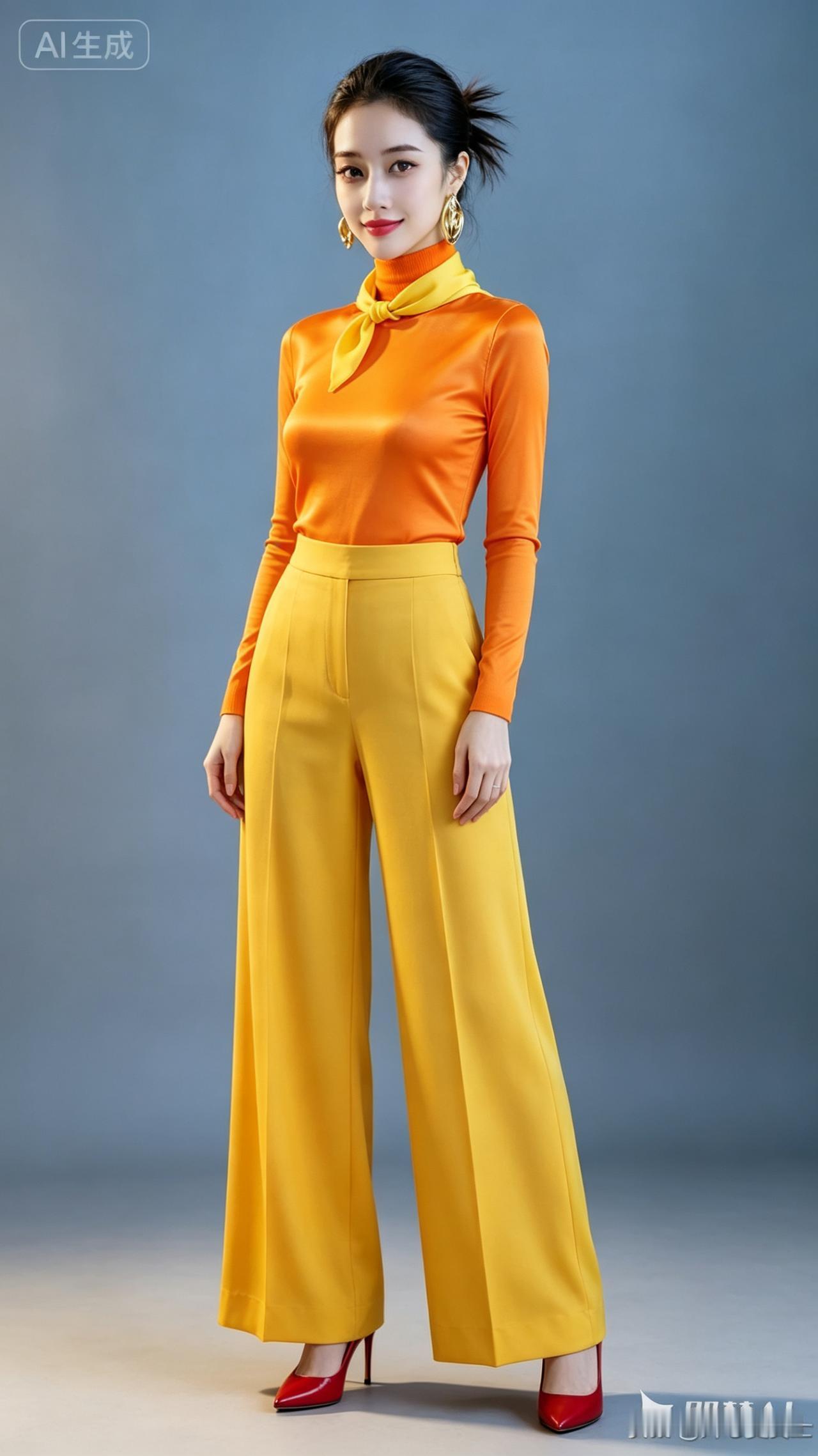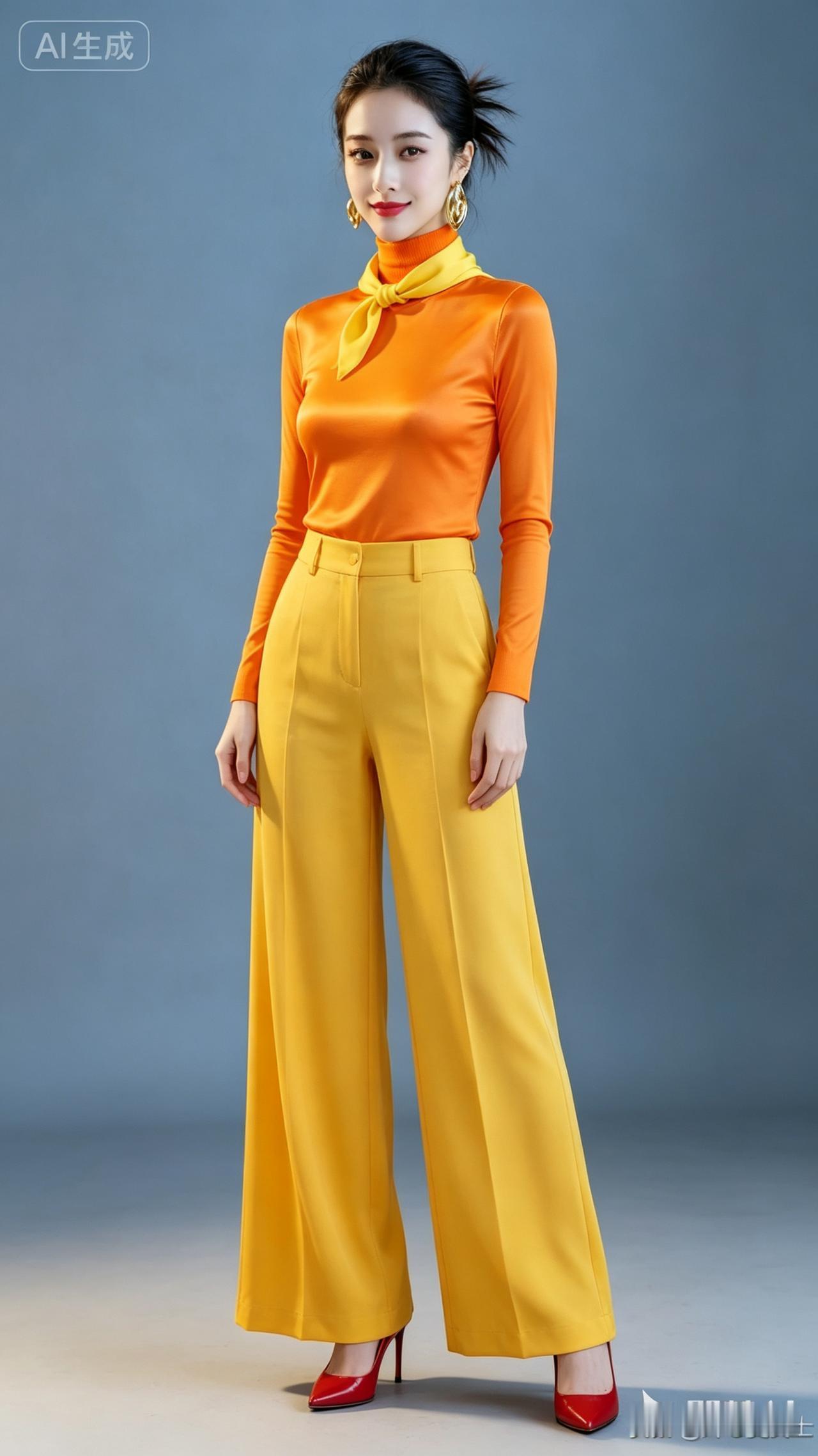 时尚穿搭指南:橙色高领衫+黄色喇叭裤,红鞋点缀,尽显优雅气质!