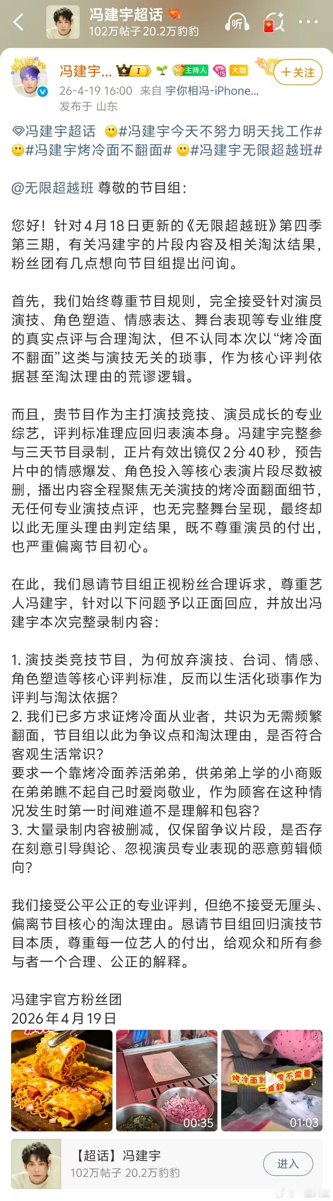 冯建宇后援会维权声明冯建宇因烤冷面不翻面被淘汰 演了一辈子戏的演员,竟然输给了“烤冷面怎么翻”?《无限超越班》作为演技综艺,评判标准让人看不懂。冯建宇的用心表演被一剪没,反而无限放大生活琐事,拒绝恶意剪辑,拒绝无厘头淘汰,请放出完整正片!