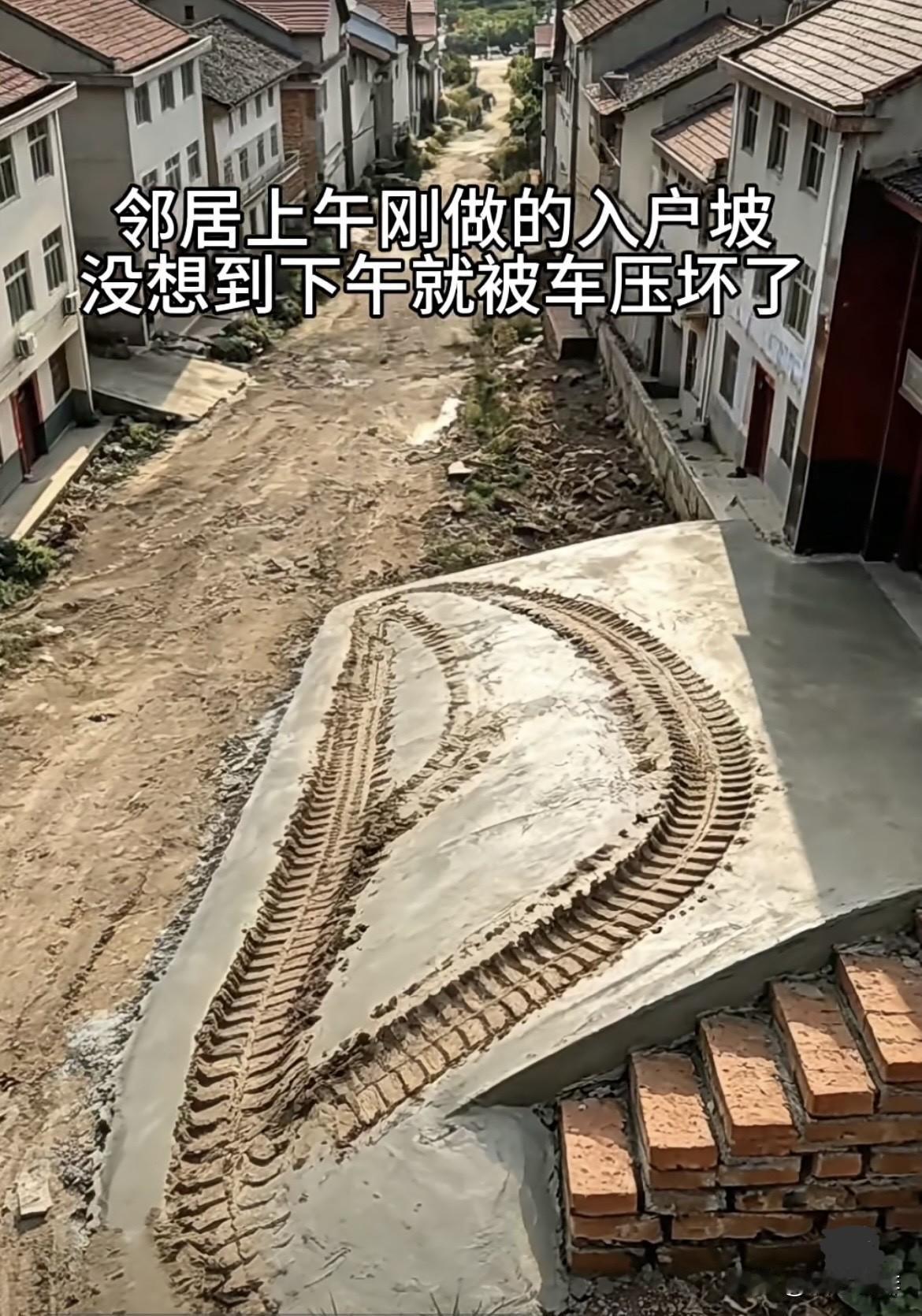 邻居上午刚做的入户坡, 没想到下午就被车压坏了。 这样还要重做吗⁉️