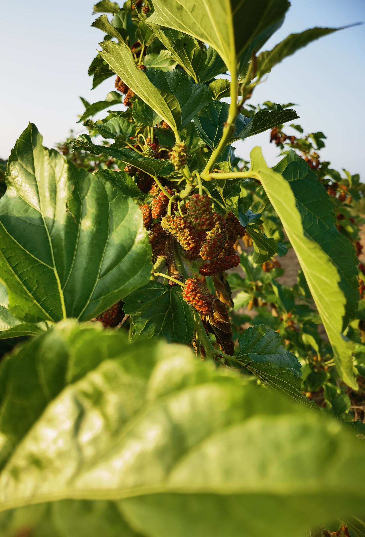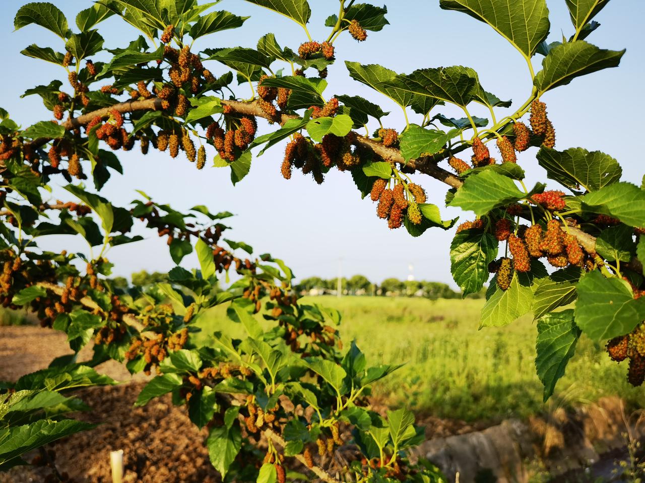 在乡村小路旁,有一棵硕果累累的桑葚树。果实丰满,透着红色,不知道是不是要等它变成