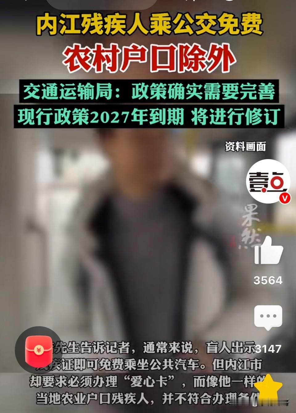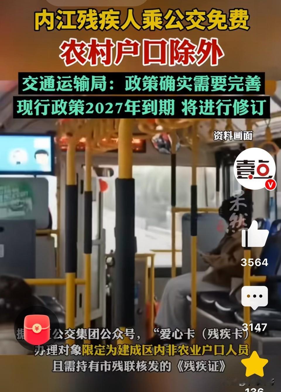 确实不应该!四川内江,城市残疾人乘车免费,农村户口残疾人却要收费。网友:都21世纪了,还有这种歧视?