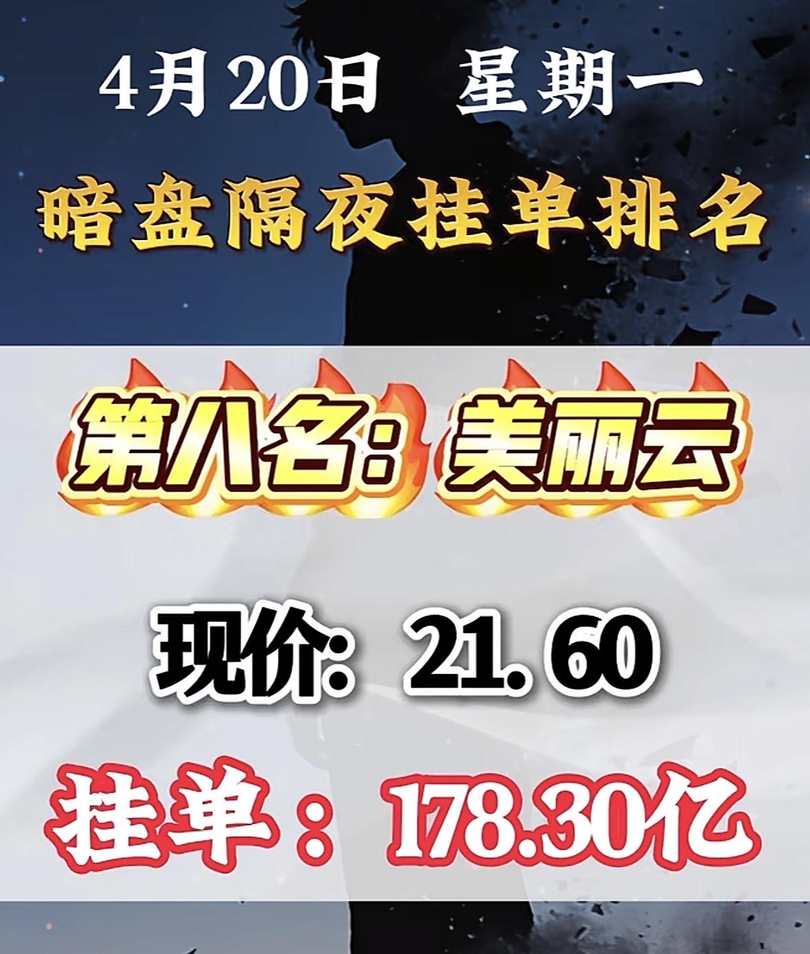 4月20日暗盘,美丽云这是要搞大事情啊!现价21.60,挂单量居然达到178.30亿。想想之前4月2日暗盘,像神剑股份挂单106.80亿、再升科技95.09亿就已经很惊人了,美丽云这次挂单量远超它们。