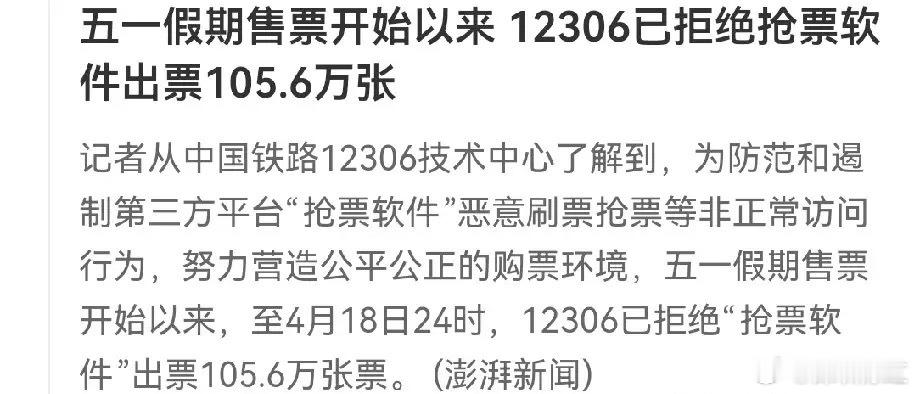 12306“五一”假期买不到票这个事,确实挺让人闹心和揪心的,也非常让人疑惑。这