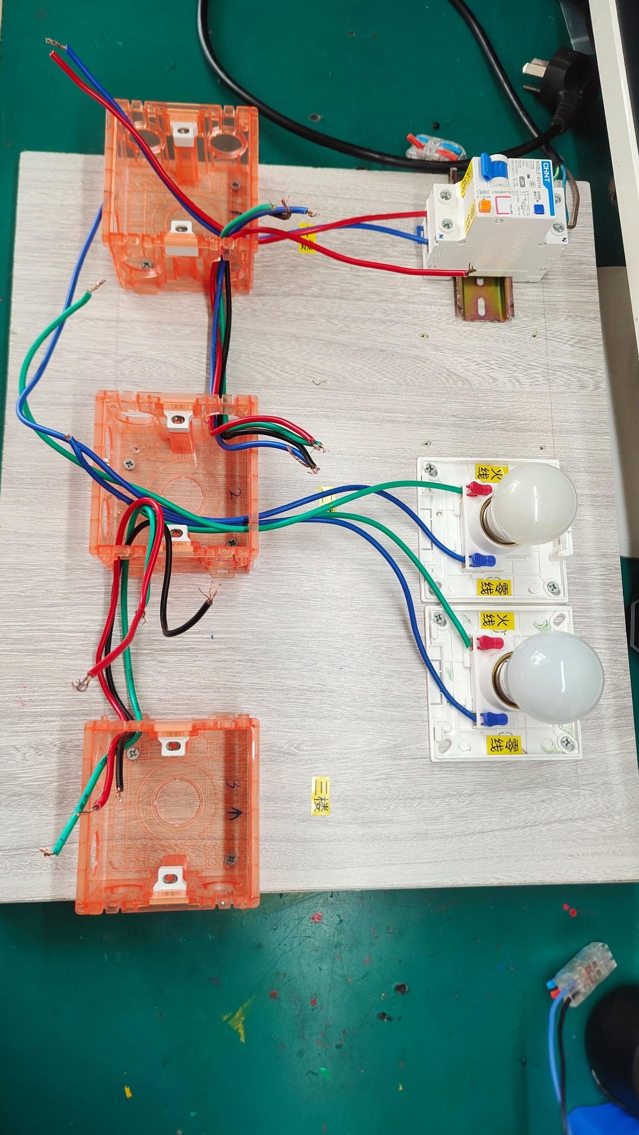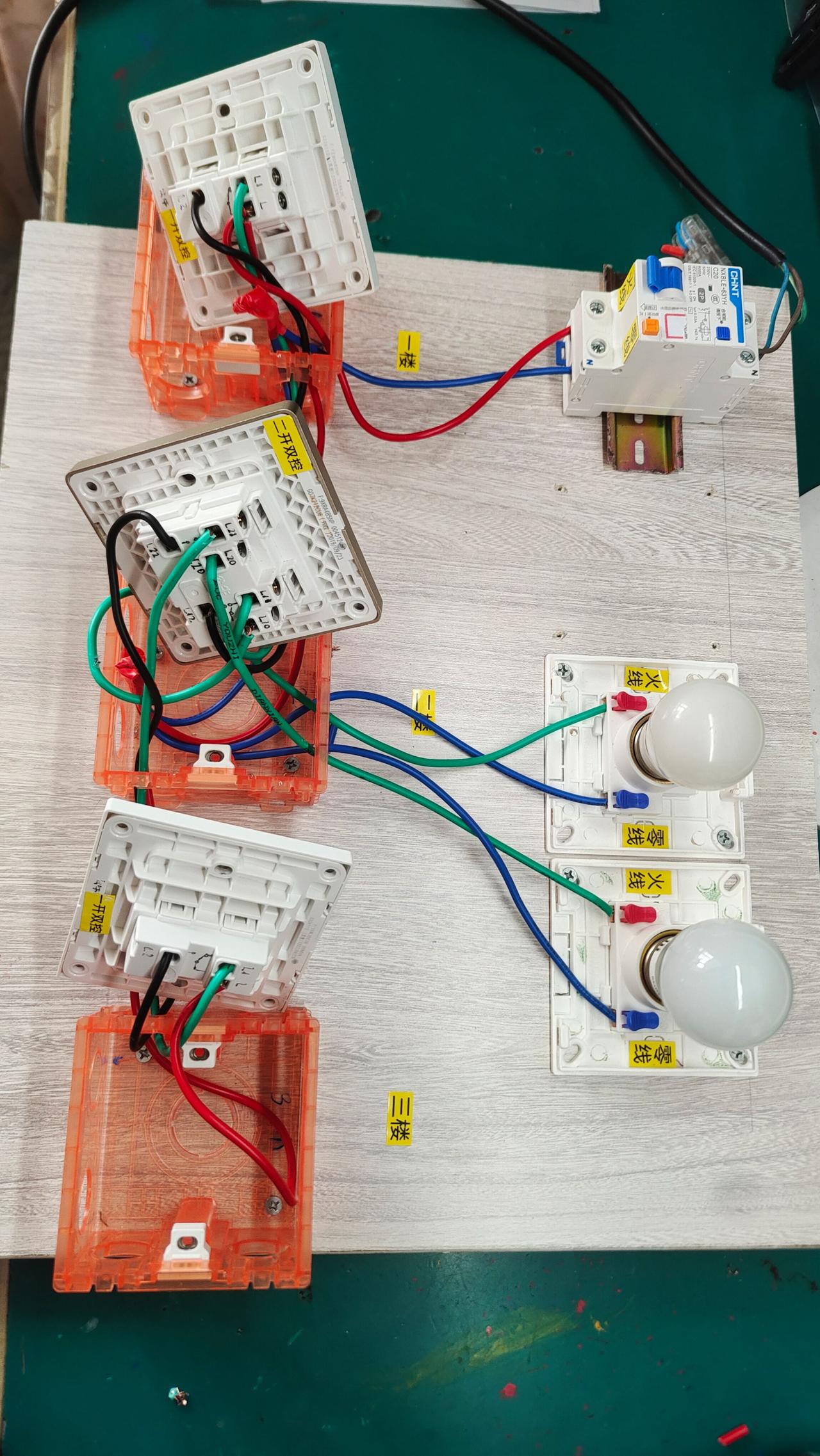 一楼安装一开双控,二楼安装两开双控,三楼安装一开双控,控制两个灯接线详细教程图。