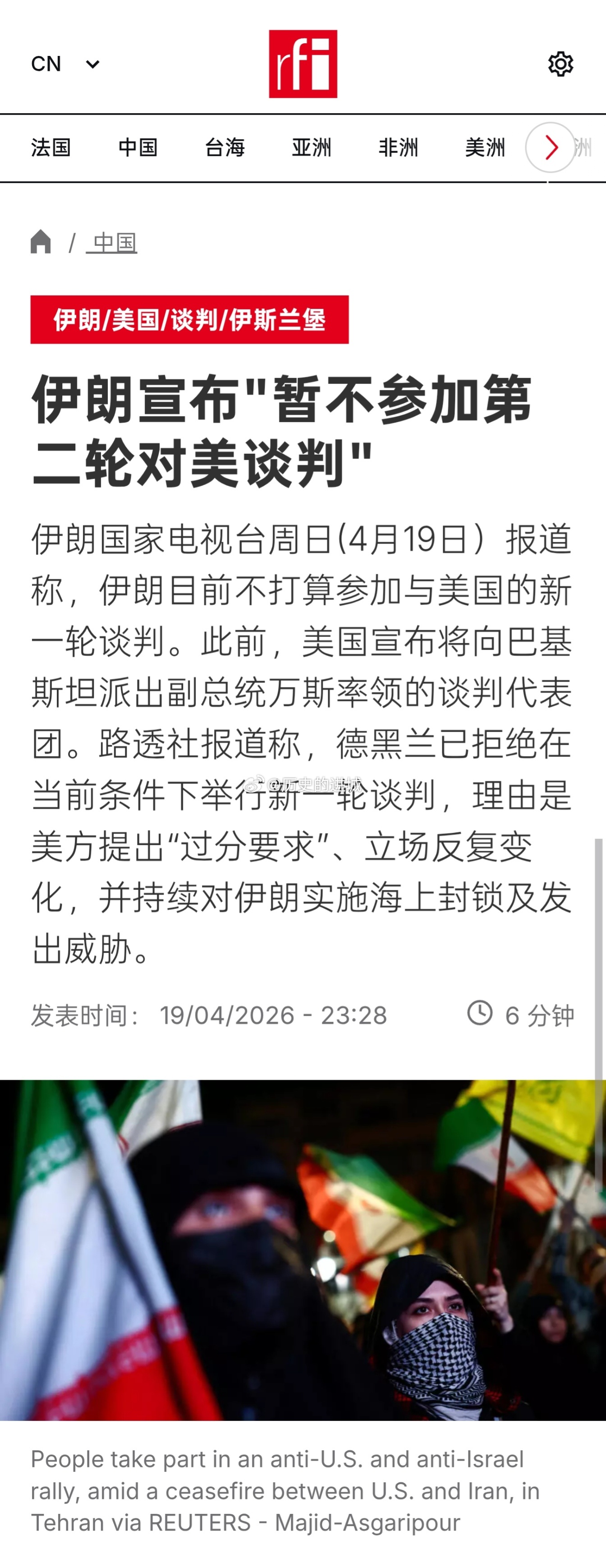 伊朗国家电视台(IRIB)援引消息人士称,关于在伊斯兰堡举行第二轮会谈的消息不属实。伊朗方面称,由于美国过分的、不合理且不切实际的要求,频繁改变的立场、不断的矛盾,以及持续进行的海上封锁、其威胁性言论,迄今为止阻碍了谈判的进展。在这种情况下,谈判取得成果的前景并不明朗。特朗普19日早些时候说,美国代表将于20日晚抵达伊斯兰堡,参加谈判。海外新鲜事 极限反转。