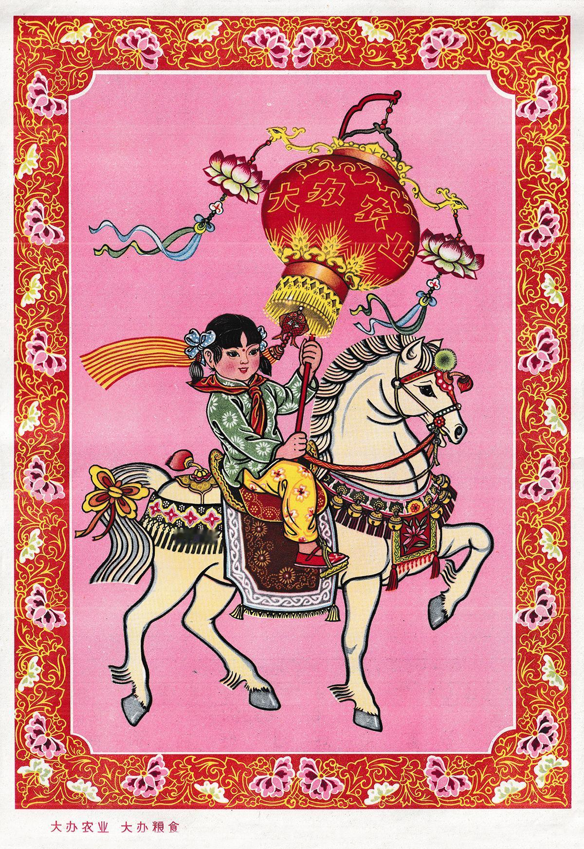 骑马少年少女,高举丰收灯笼