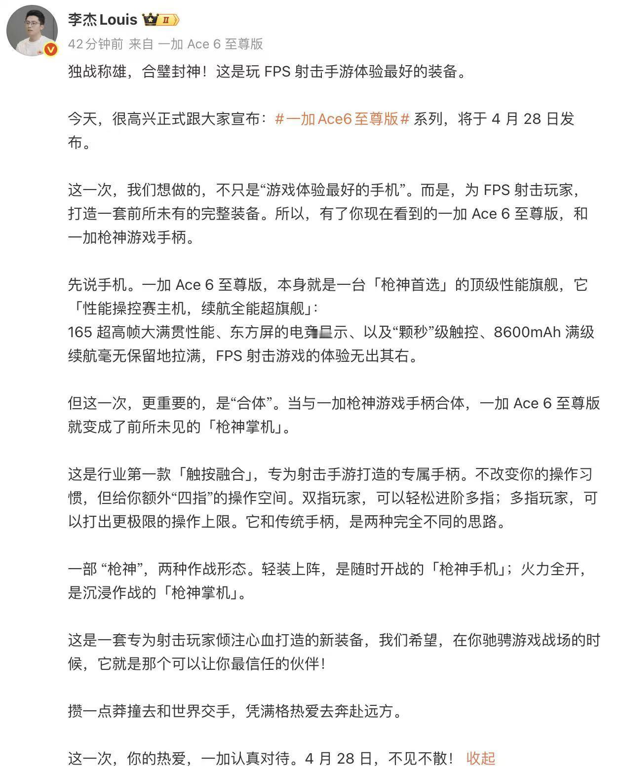 应该是本月的最后一款新机,一加Ace6至尊版也官宣了,4月28日发布。