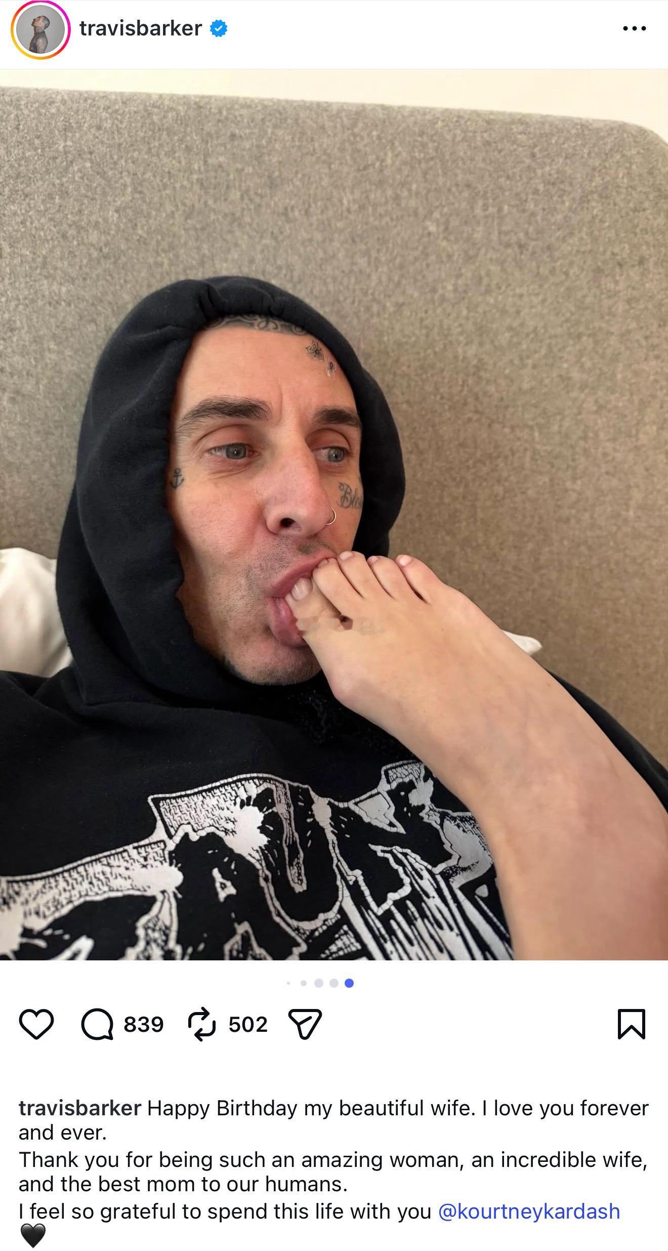 Travis Barker为Kourtney庆生🎂晒出了一张他吮吸Kourtney脚趾头的照片