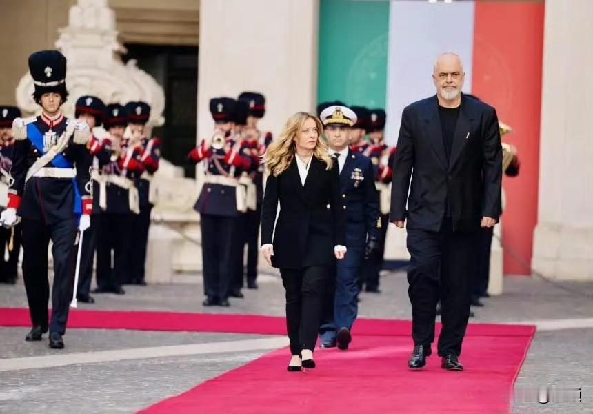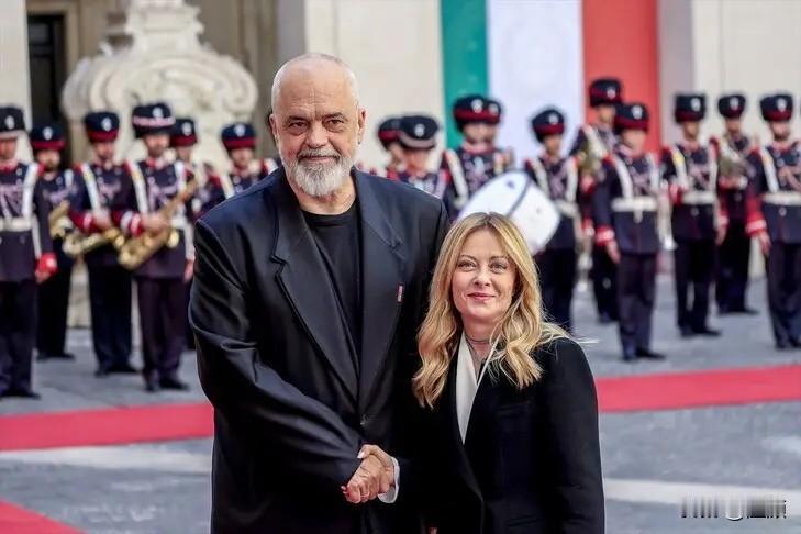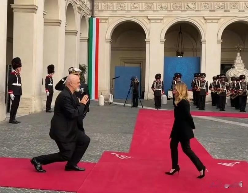 又跪了!当地时间2026年4月16日,身高超两米的阿尔巴尼亚总理埃迪·拉马出访意大利,在与身形娇小的意大利总理梅洛尼会面时,再次做出单膝跪地的举动,以极具绅士感的方式拉近身高差距。