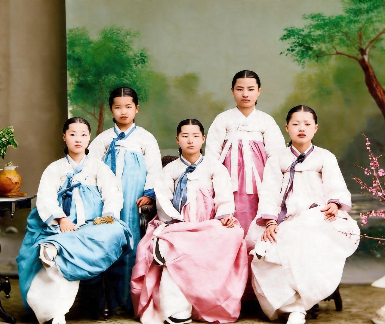 这是百年前朝鲜的五大美女聚在一起。她们个个面如银盘,骨架很大,身板挺直,气质拉满