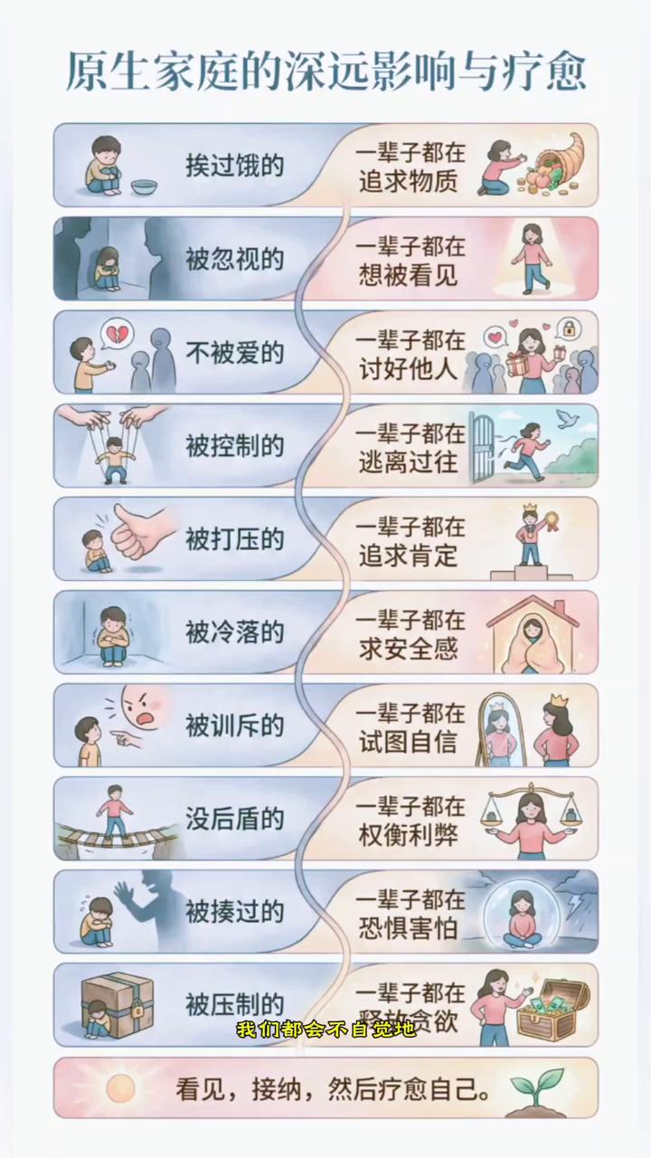 小时候缺失的所有贪欲我们都会不自觉地用往后半生去填贪欲,但你要明白过往的烙印不是你的宿命。看见、接纳、然后疗愈自己才是疗愈的开始。你不必用一生偿还童年的遗憾,你可以重新养育自己。