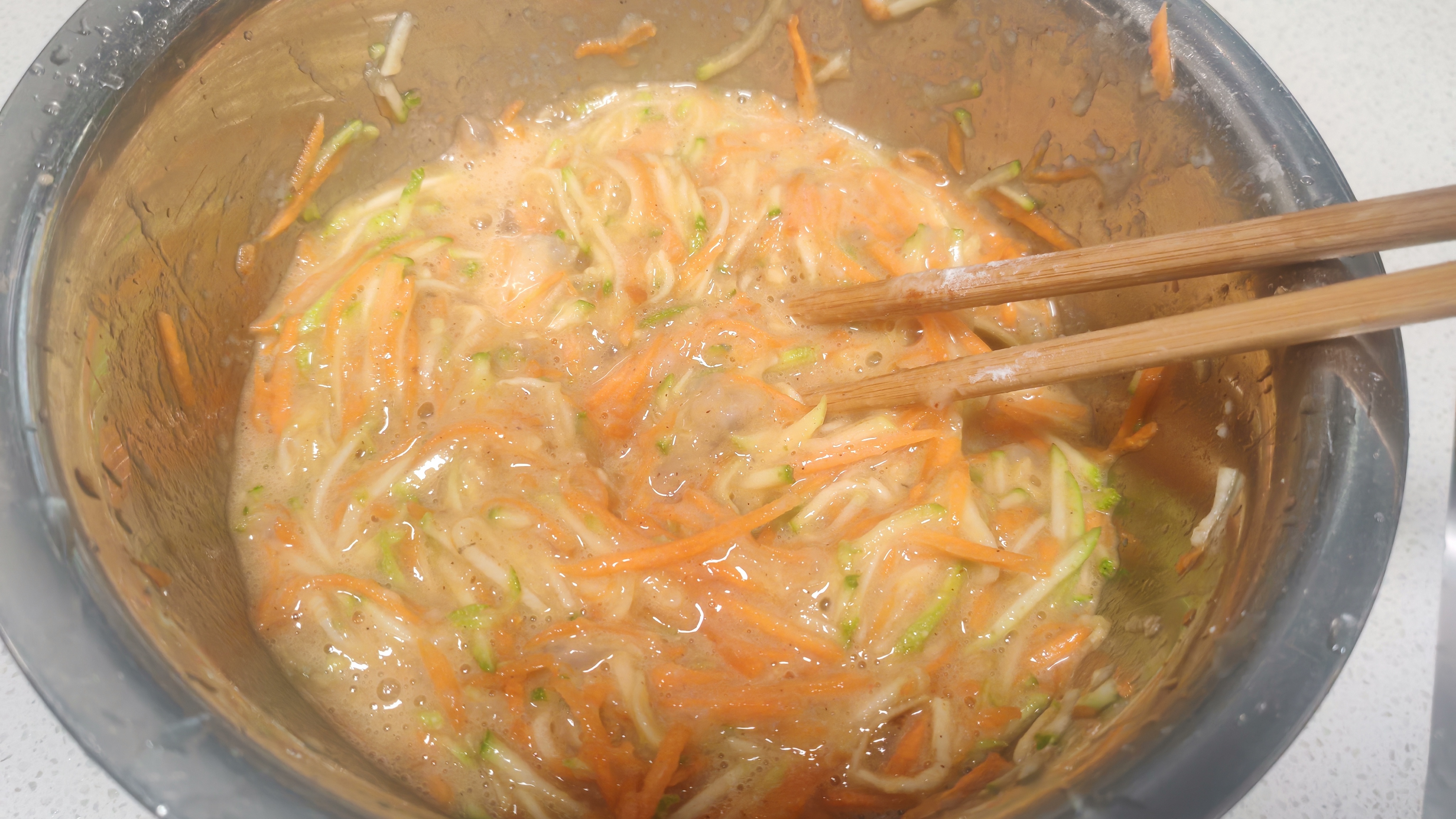 胡萝卜西葫芦擦丝+虾滑+鸡蛋+适量面粉,我鸡蛋放多了,整体就比较湿,也可以换别的蔬菜,黄瓜也可以,看爱吃什么,水分多的先杀杀水