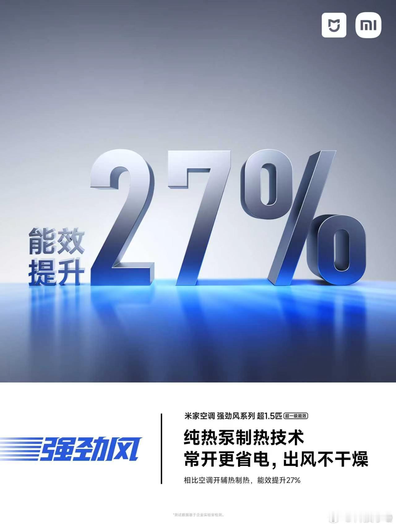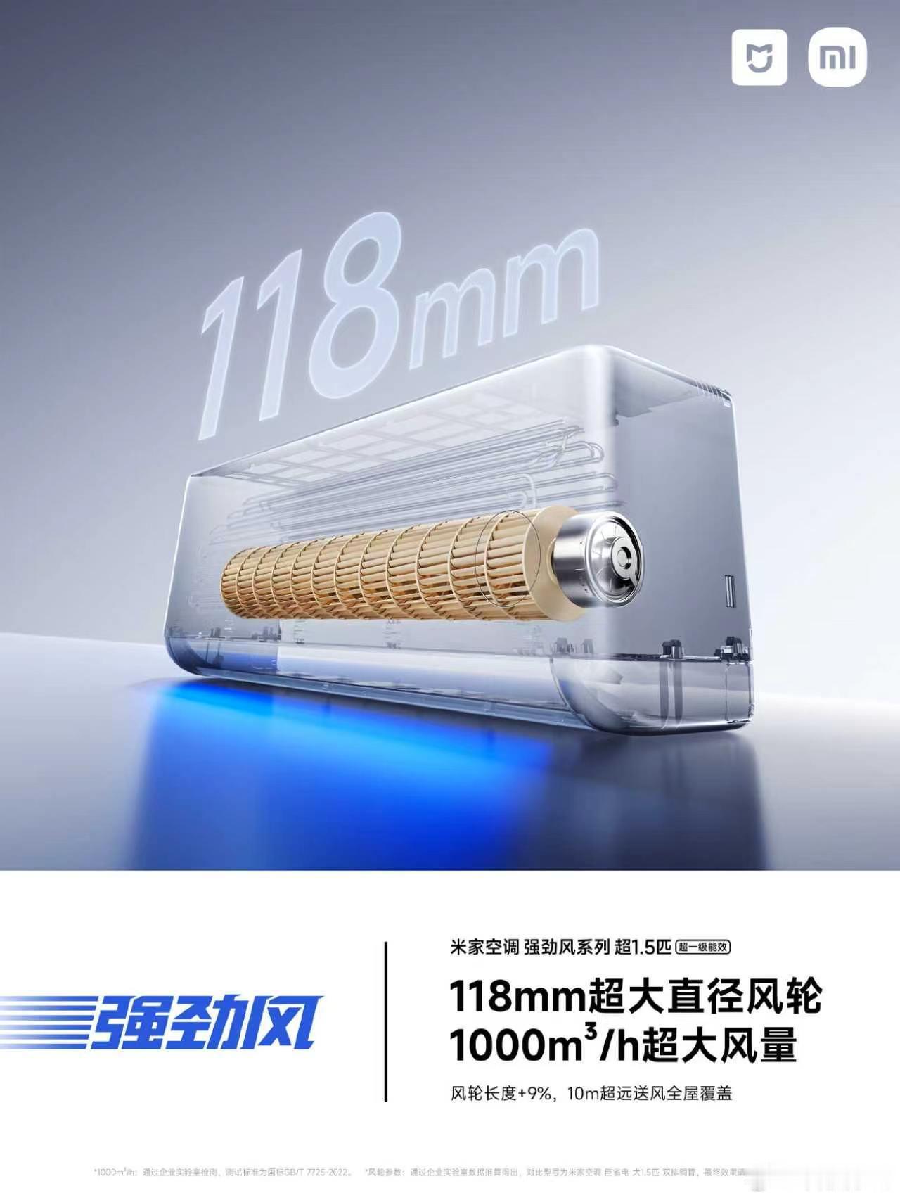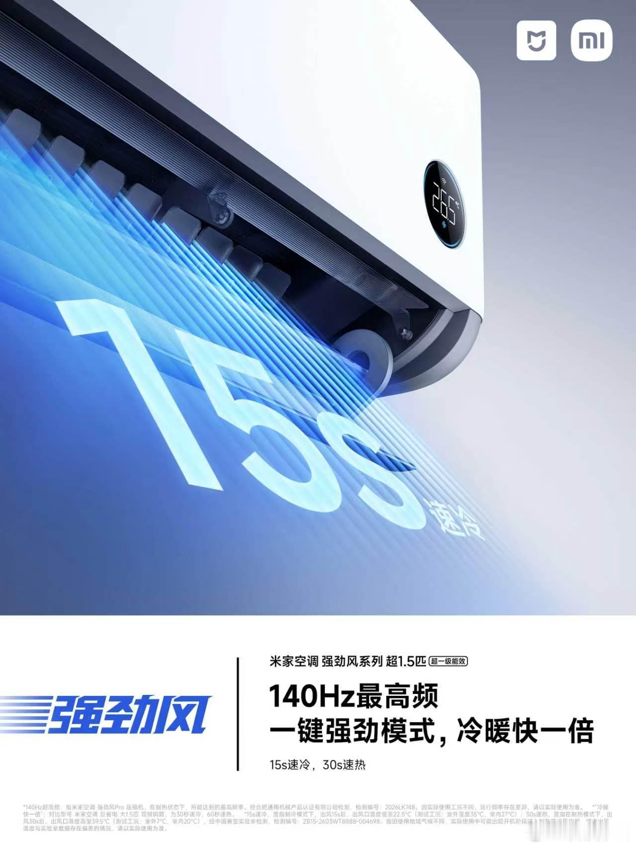 米家空调强劲风 Pro 超1.5匹超一级能效来啦!!同档最强制冷热能力、最省电、最舒适、最智能,全面超越1.5匹的高性能空调同档最大13cc超大排量双缸压缩机,比同档空调排量大26%;更搭载大双排纯铜管换热器、118mm大直径风轮,1000m³/h 超大风量,实力媲美2匹挂机,161s全屋快速冷暖。APF 6.30,AI节能率高达47%,全年省电约242元;外加超低频4Hz,精准控温还省电,温度波动≤±0.3℃3000元档最优解,能力对标大金!