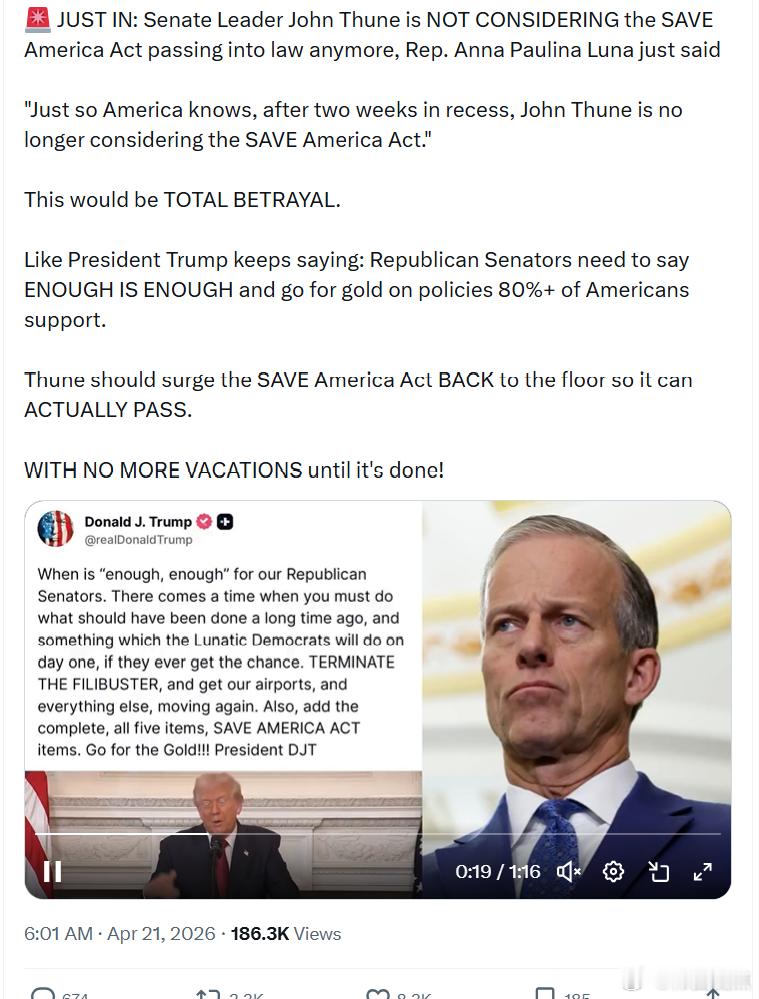 国会议员安娜·保利娜·卢纳刚刚表示:参议院领袖约翰·图恩已经不再考虑推动《拯救美国法案》