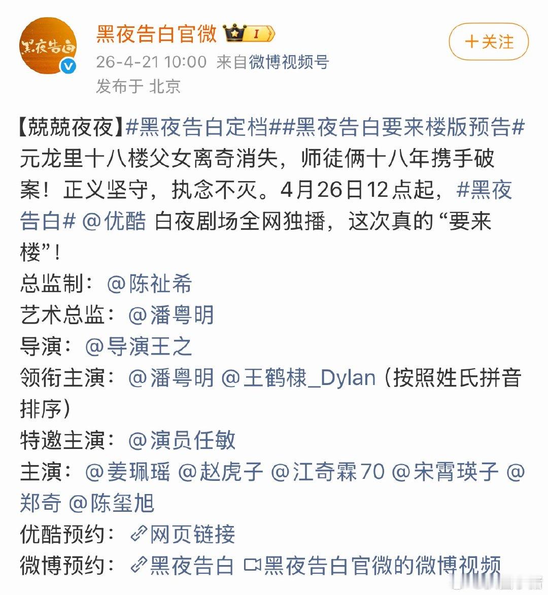 潘粤明王鹤棣《黑夜告白》定档4月26日!燥候黑夜告白定档