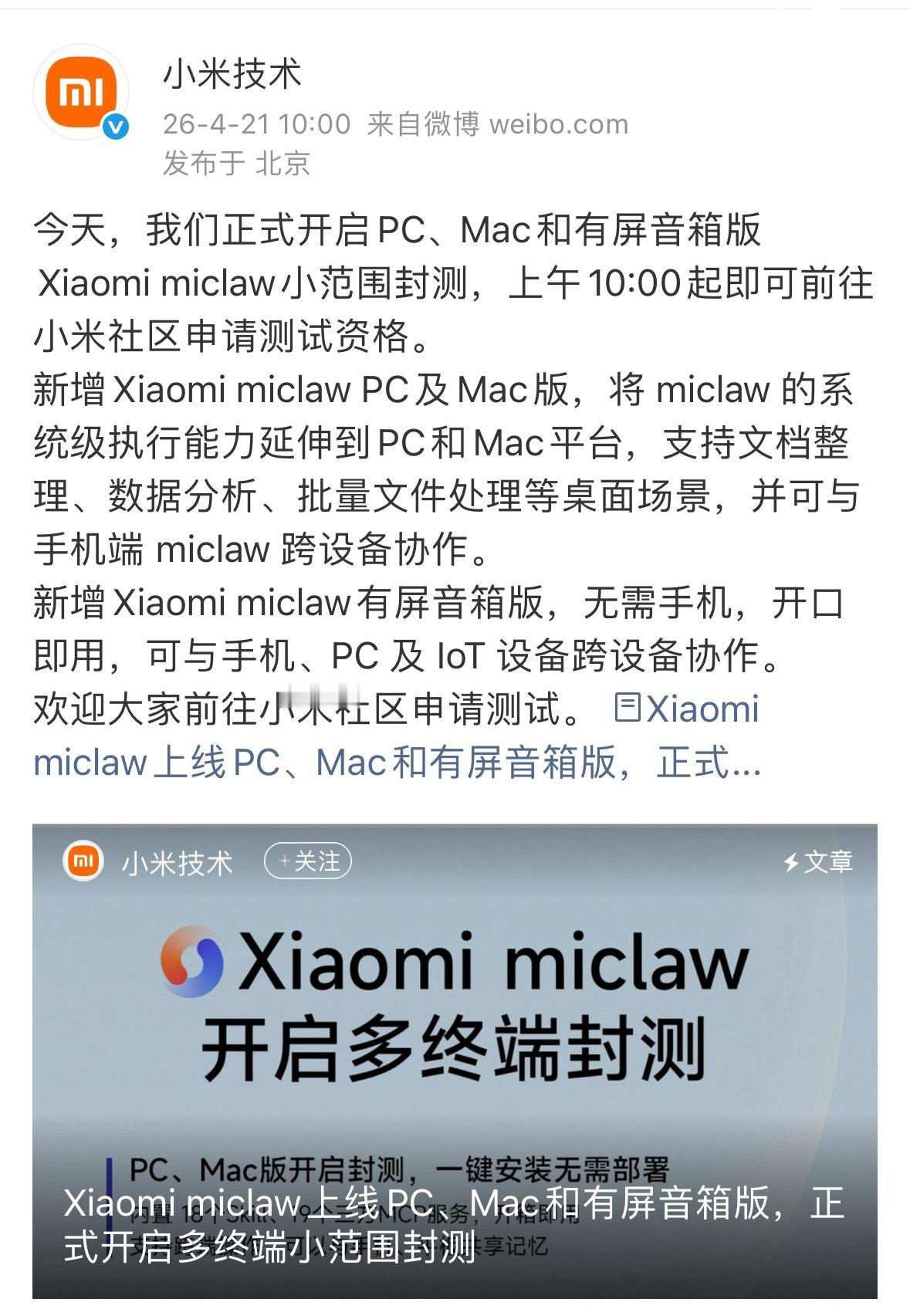 现在的小米MiMo大模型已经跻身行业第一梯队,MiMo V2-Pro也霸榜OpenRouter调用量一个月,小米的AI进展确实越来越快了,也越来越智能了。小米发布PC和Mac版龙虾