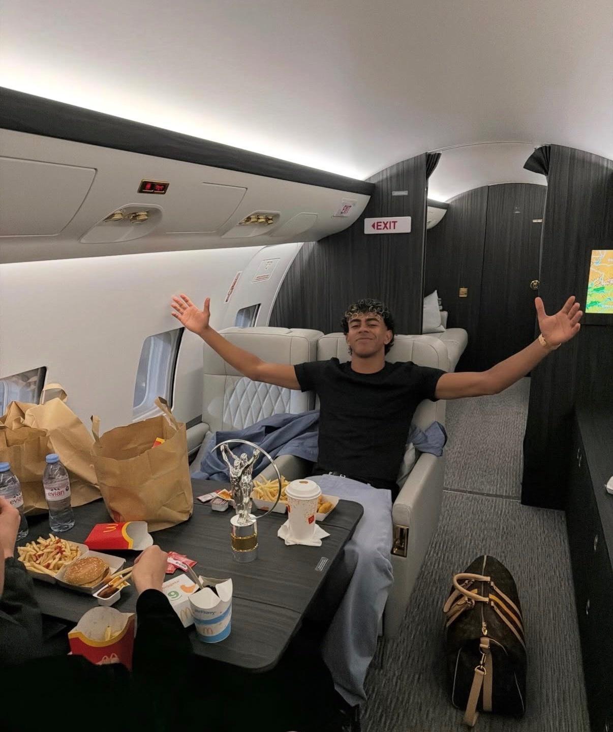 亚马尔在马德里领取2026劳伦斯最佳青年运动员大奖后,乘坐私人飞机回巴塞罗那。然后晒出了这张吃麦当劳大餐的照片