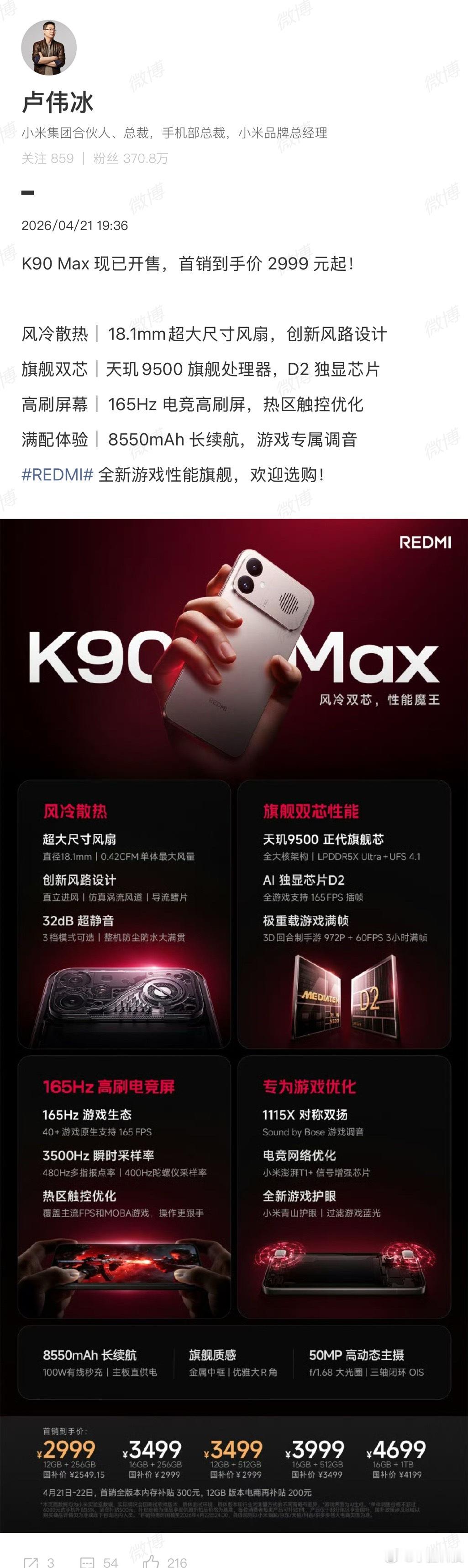 卢伟冰回应K90Max定价亏损亏不亏不知道,但是单单从配置来看,红米K90 Max各方面确实很可以。例如风冷散热,18.1mm超大尺寸风扇搭配创新风路设计,能很好控制发热等问题。网上实测大家也都看到了,长时间打原神等高负载游戏,机身也不发烫发热。风扇运行噪音很低,深夜宿舍打游戏也不会打扰到他人。其次还有旗舰双芯加持,天玑9500处理器搭配D2独显芯片,165Hz电竞高刷屏,不管是多任务切换,还是运行大型手游,都能做到不卡顿、不掉帧。8550mAh的超大容量电池,即便是手机重度依赖者,也不会有续航的焦虑。可以说,2999元这个价位段,这样配置全面、体验能打的机型,真的很少见,卢伟冰说亏损我感觉大概率是真的。不过也是因为这个原因,目测这款手机的销量应该会很顶。用户现在都聪明的很,价位和配置一对比,什么都出来了。