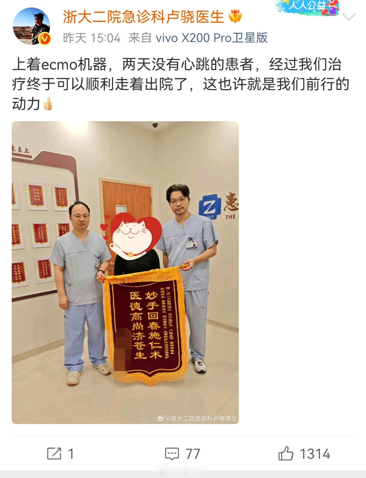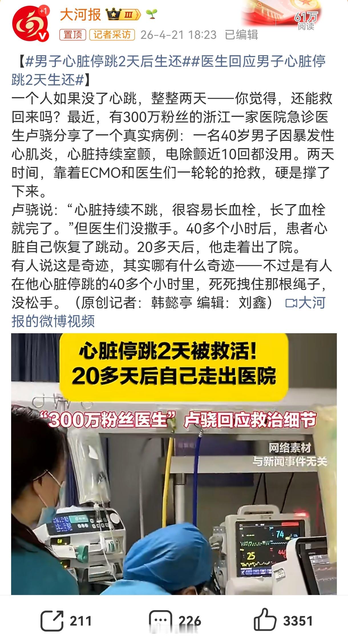 男子心脏停跳2天后生还 标题党啊,不是心脏骤停,是暴发性心肌炎;不是完全失去心脏功能,而是使用了体外心肺机ECMO。不过这样都能救下来,已经很了不起。只是这机器开机8万,一天一万,价格挺昂贵的,希望后续中国制造能把价格打下来!