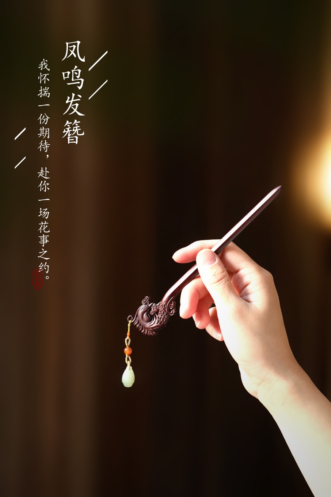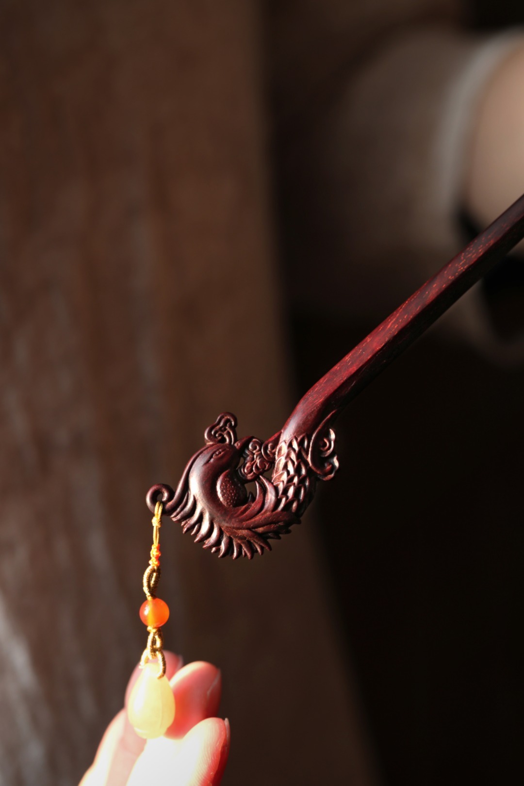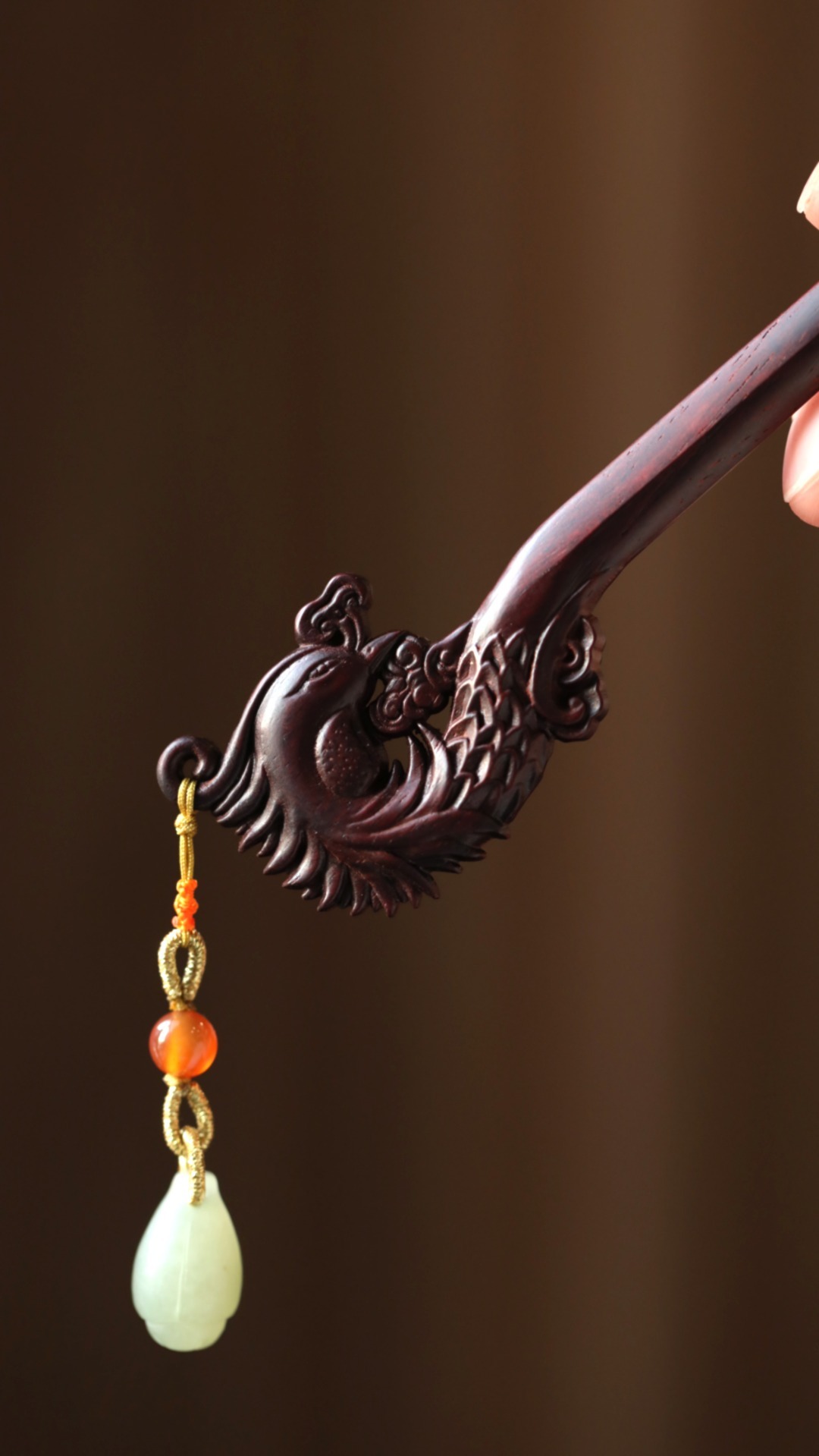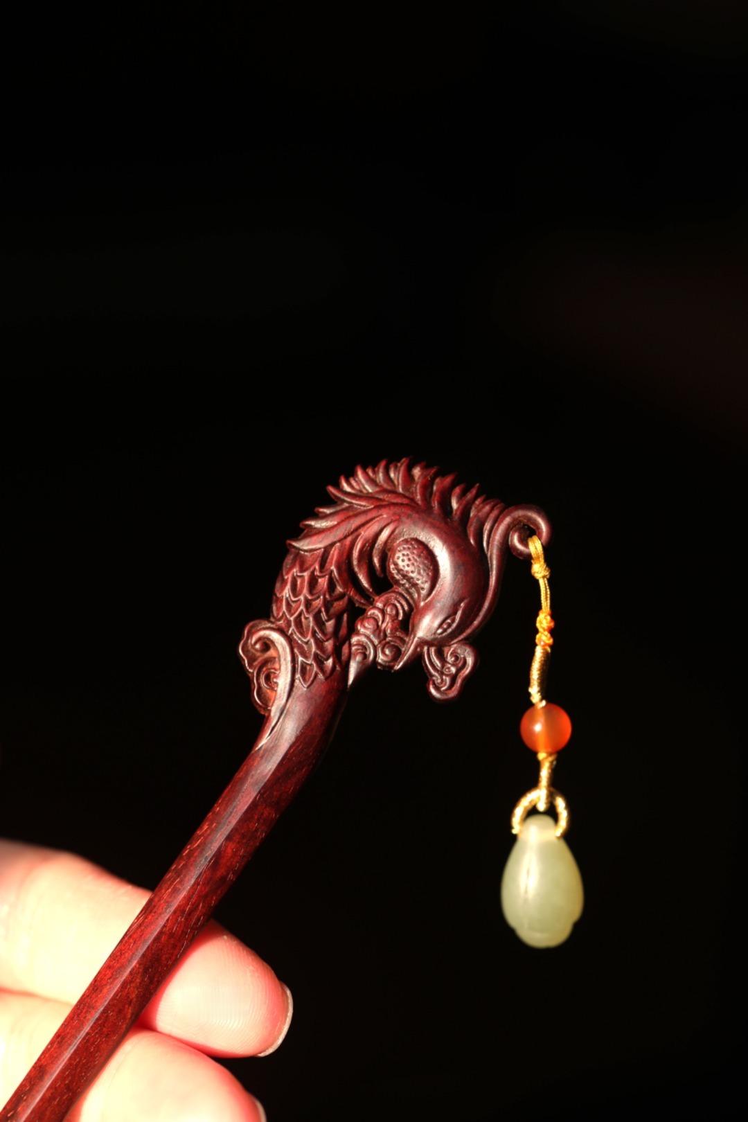 鳯凰,古代雌性瑞兽之骁楚,此发簪以紫檀镂空双面雕刻凤纹;纹理天然,纤细柔润。